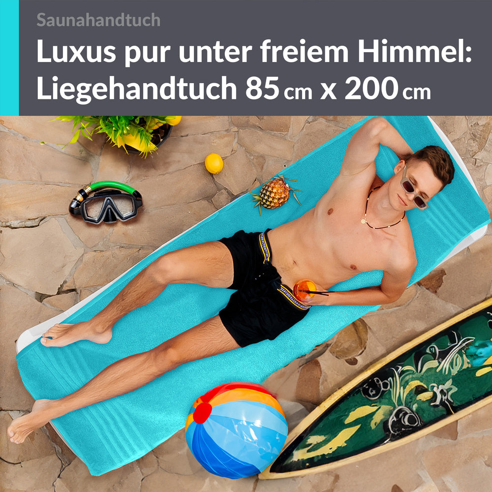 Unser türkises Badetuch als wahrer Hingucker! Mit der schönen Farbe Lagunen Türkis und schlichtem Handtuch Design begeistert dieses einfarbige Liegehandtuch jeden.