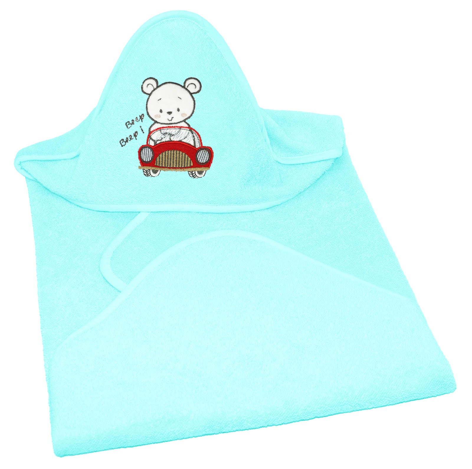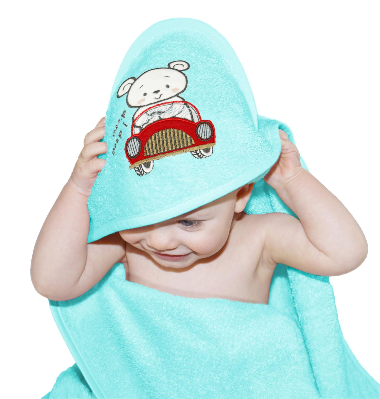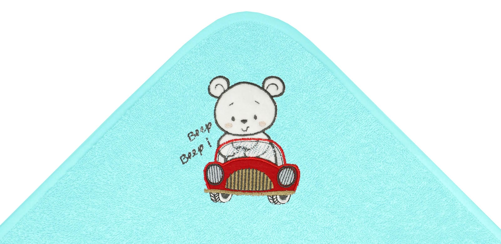 Ein liebevoll aufgestickter Teddy im Auto blickt von der Kapuze dieses Motiv-Handtuches, wodurch es zu einem echten Hingucker in Blau für kleine Abenteurer wird.