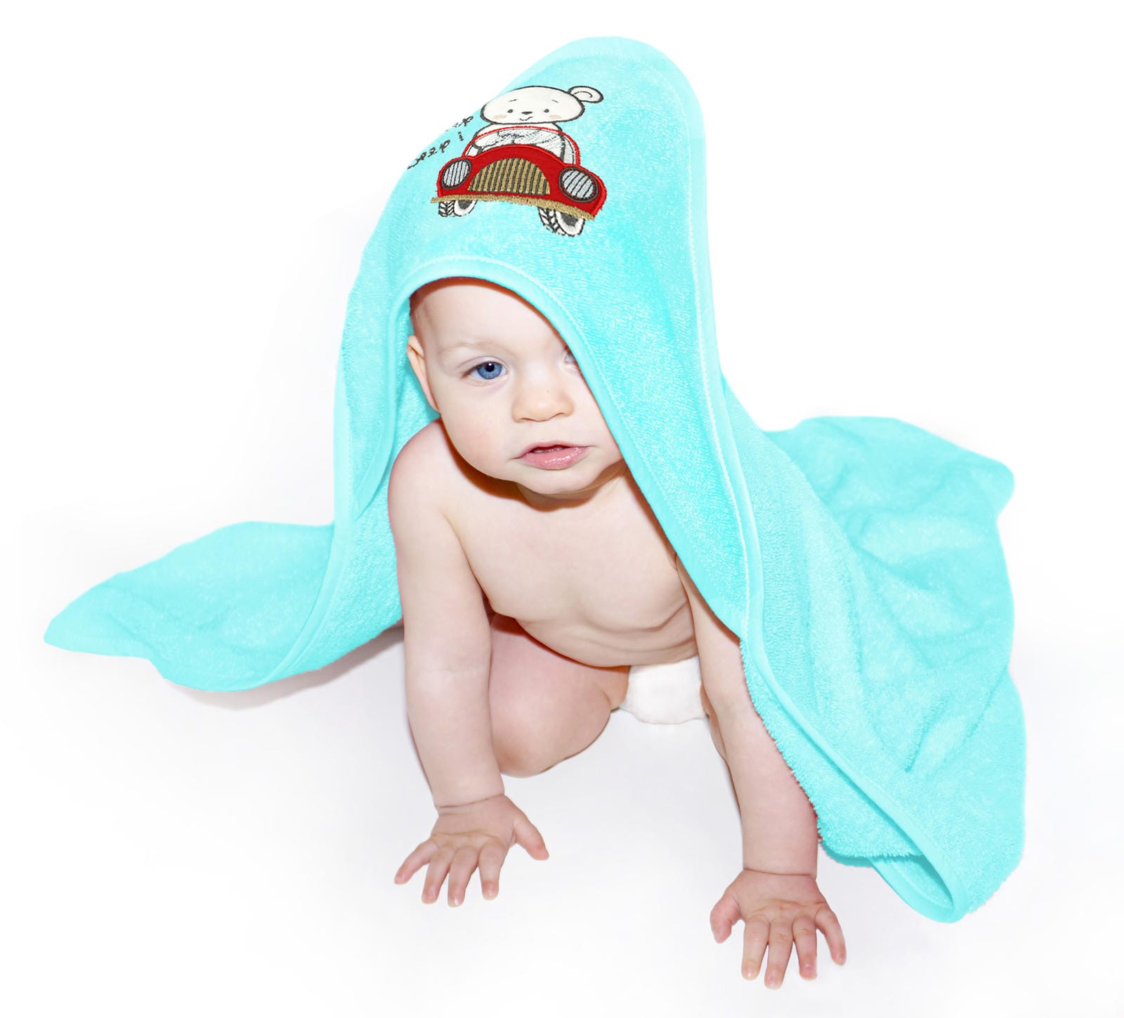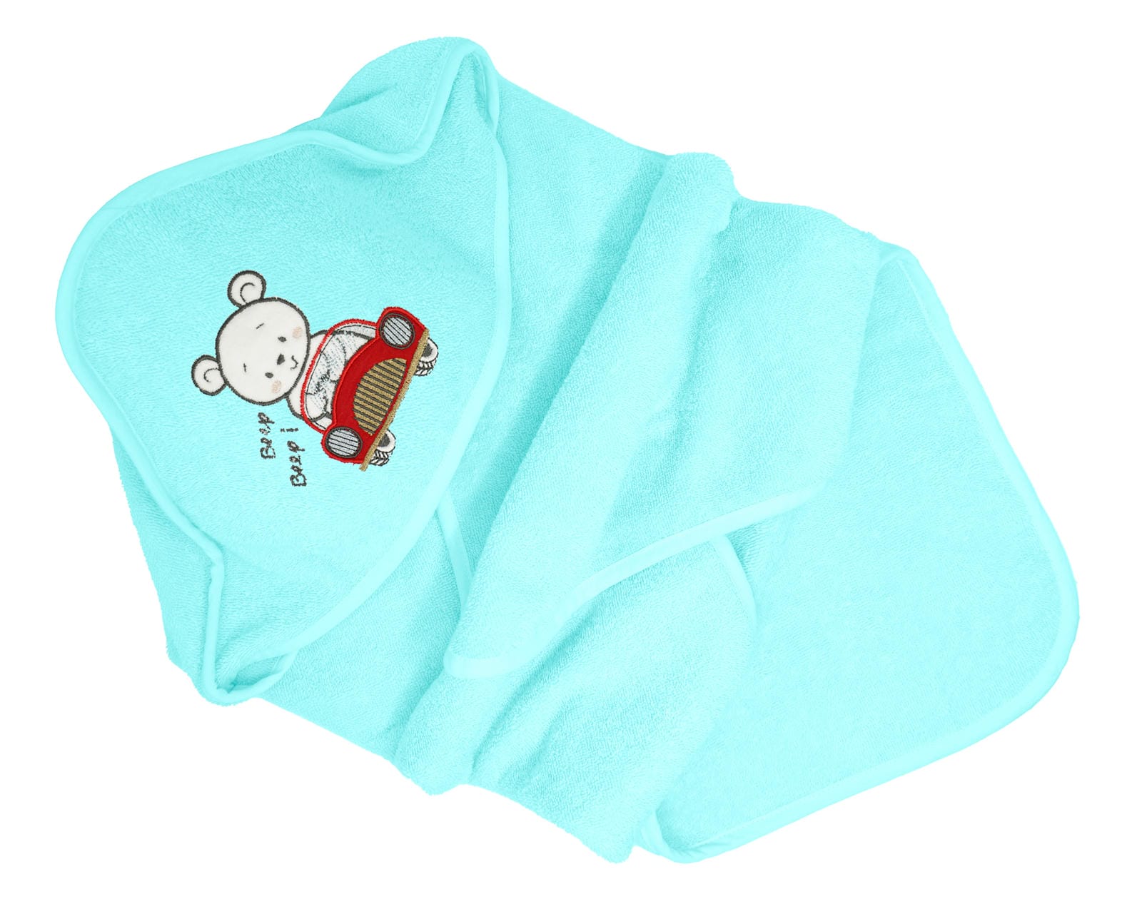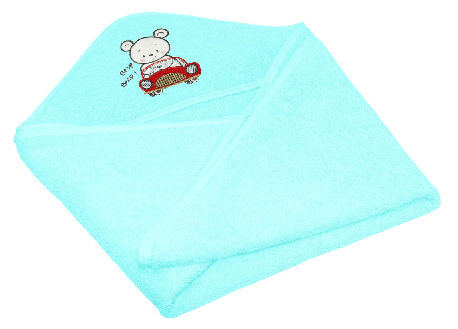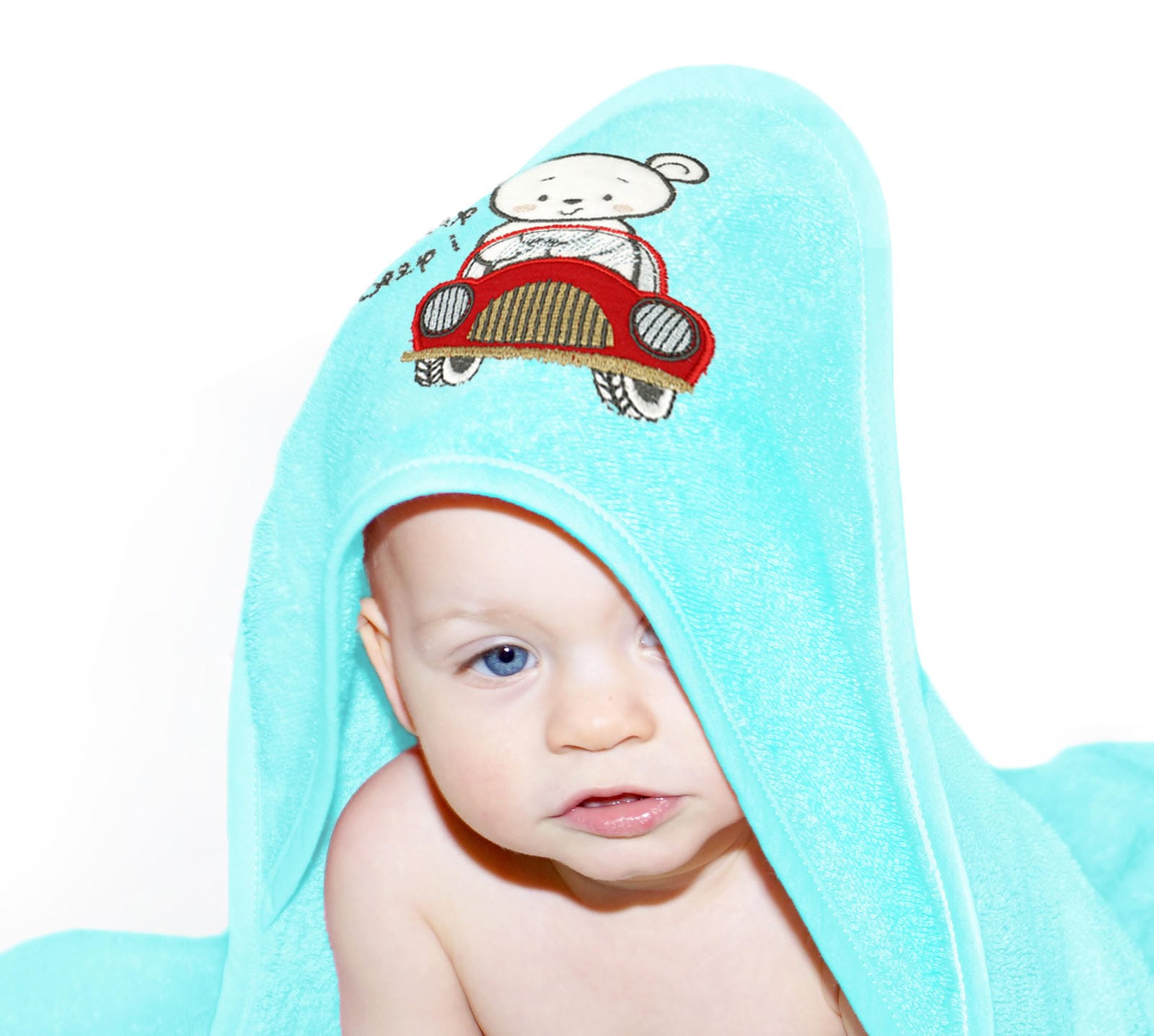 Ein liebevoll aufgestickter Teddy im Auto blickt von der Kapuze dieses Motiv-Handtuches, wodurch es zu einem echten Hingucker in Blau für kleine Abenteurer wird.