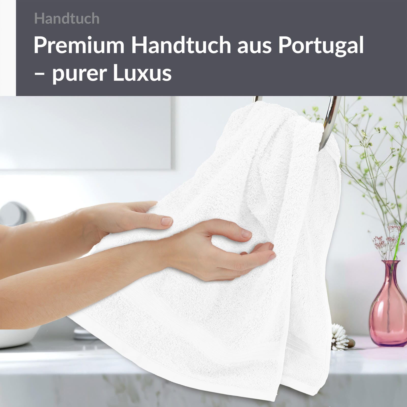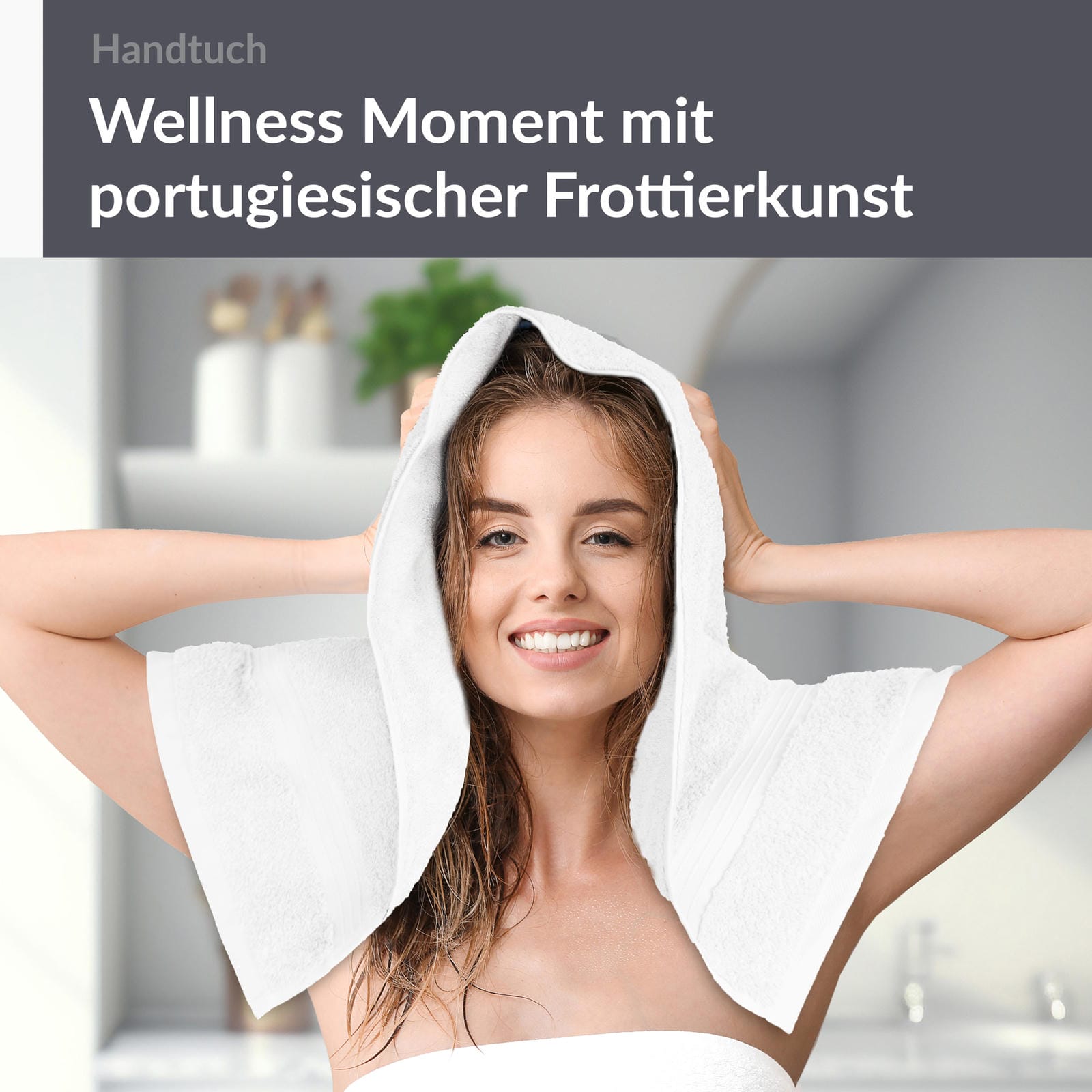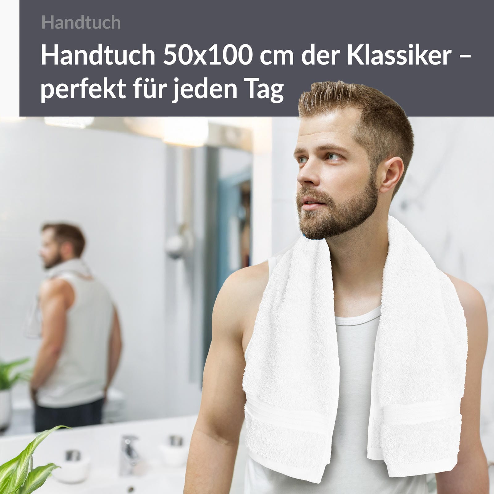Ob als saugstarkes Fitnesshandtuch oder im Badezimmer, stets möchten Sie dieses edle Handtuch ca. 50 x 100 cm in Rein Weiß an Ihrer Seite wissen.