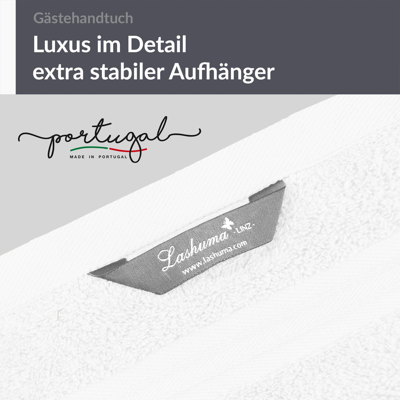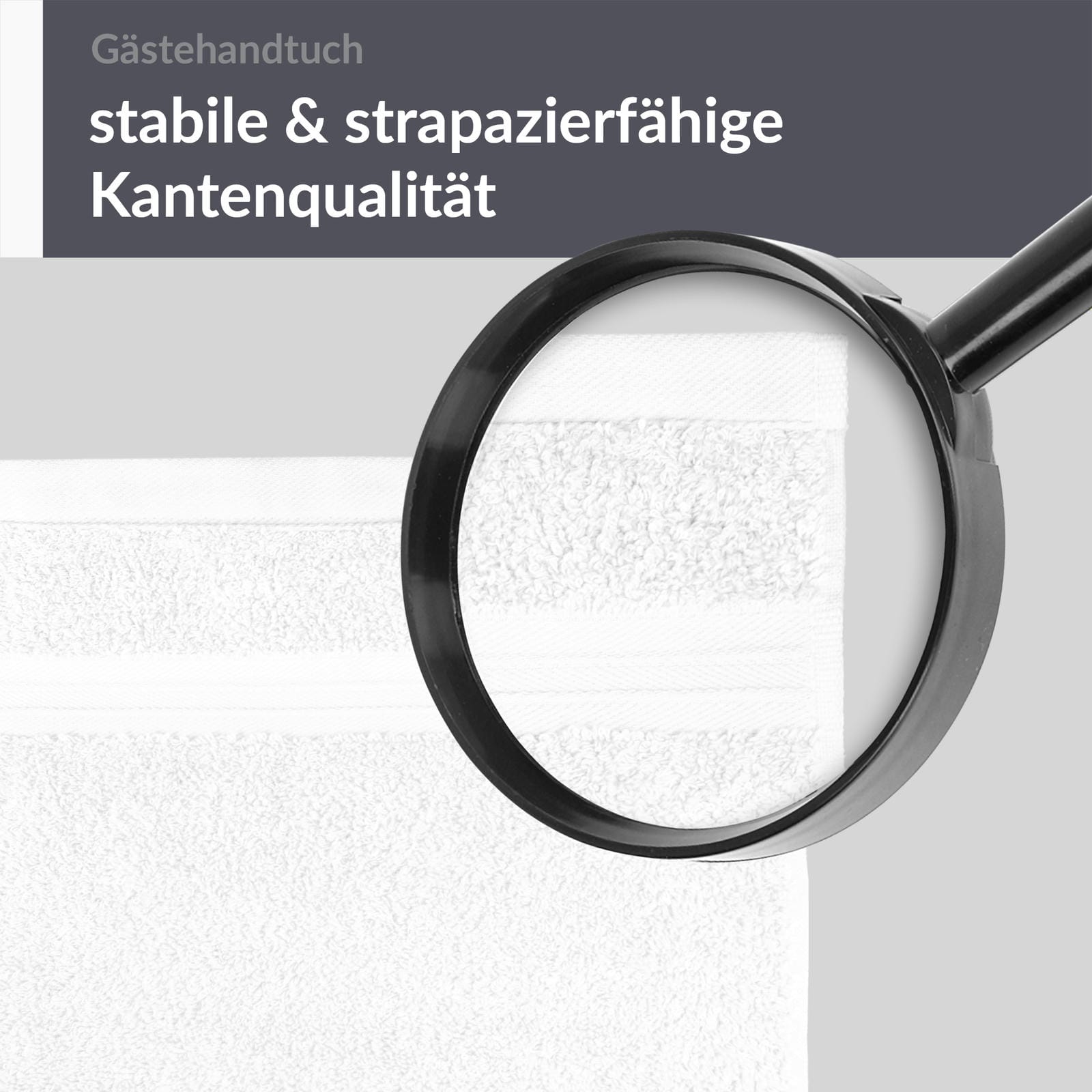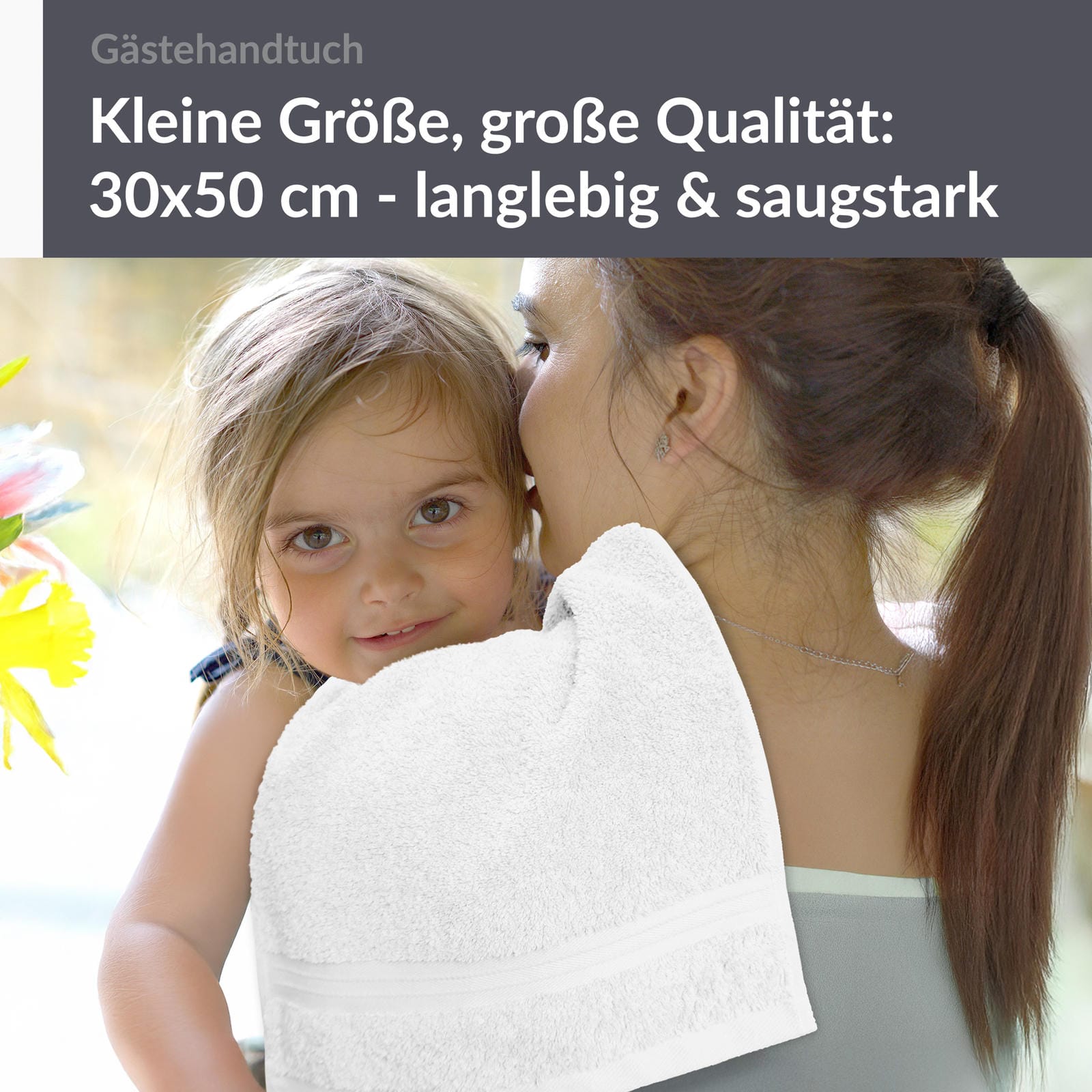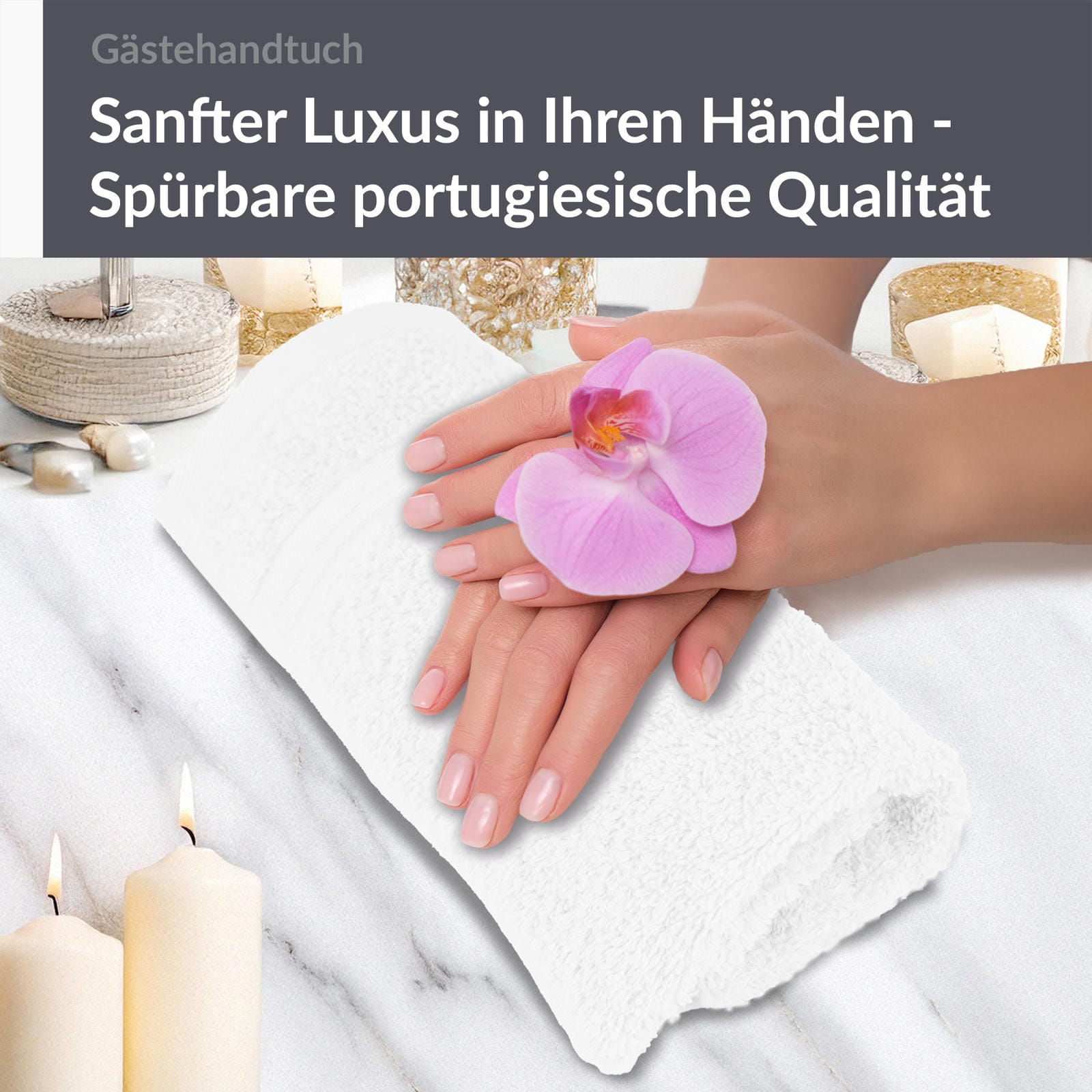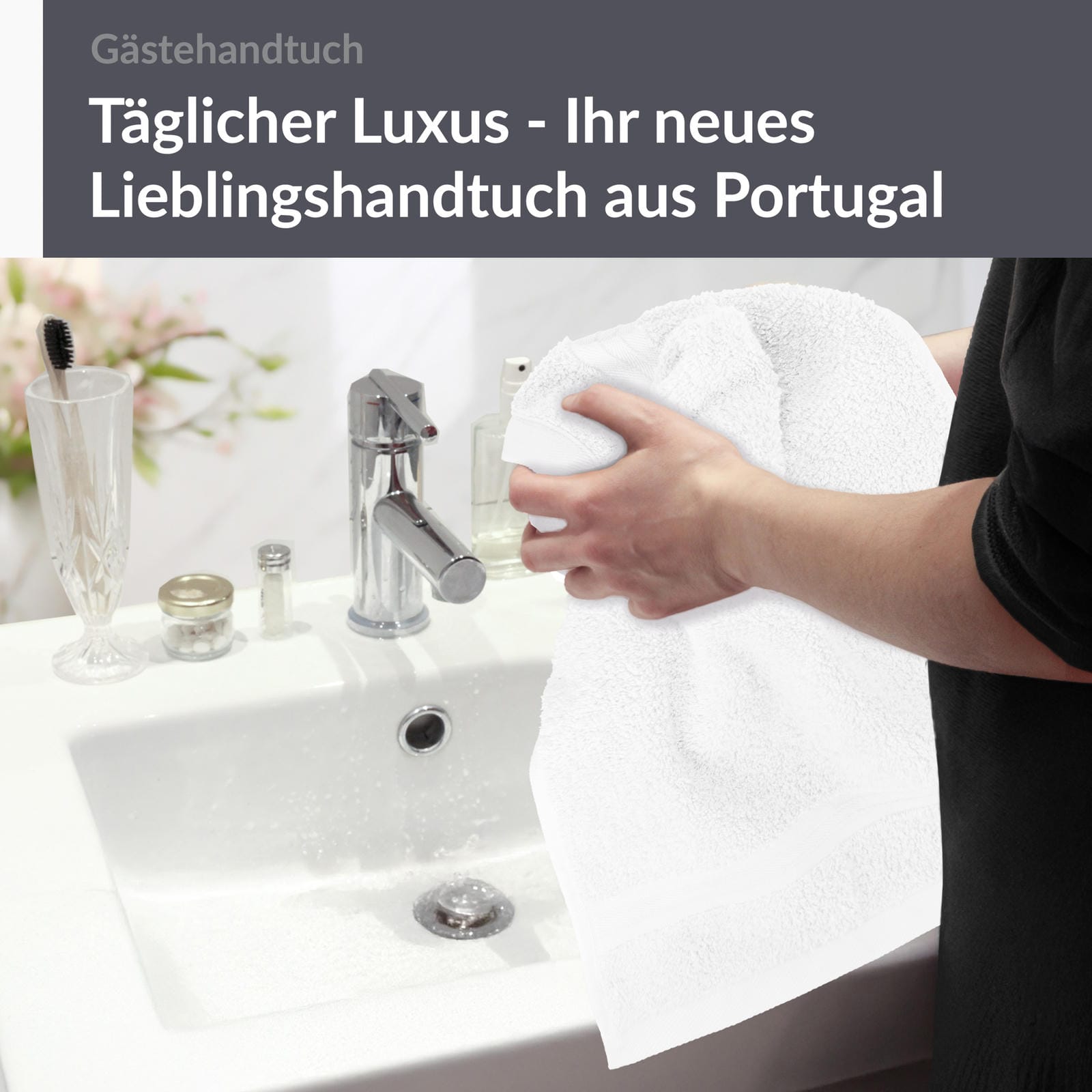 Entdecken Sie unser edles Gästetuch in strahlendem reinen Weiß! Ob im Badezimmer oder in der Küche, dieses moderne Frotteetuch mit den Maßen ca. 30x50 cm ist stets ein echter Hingucker.