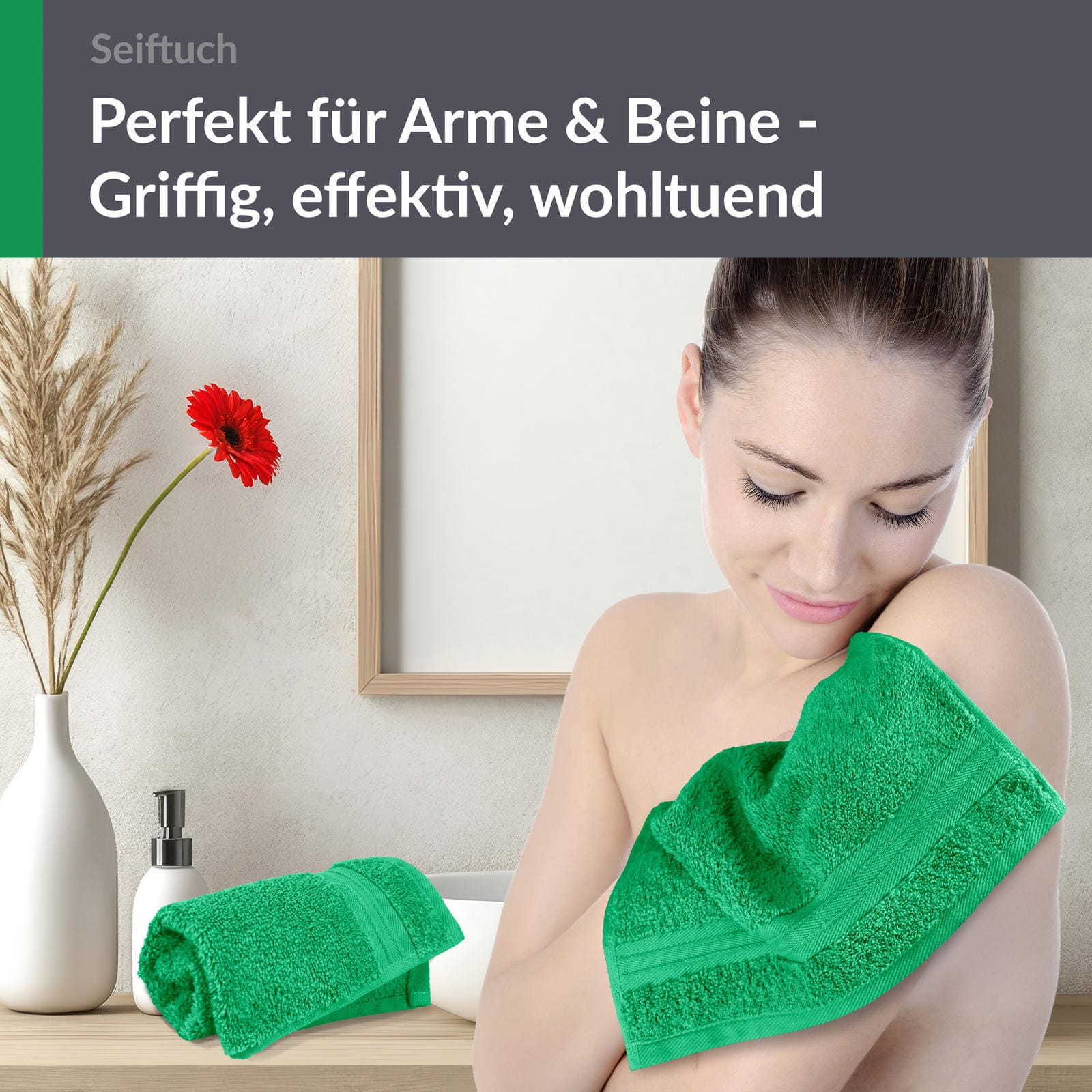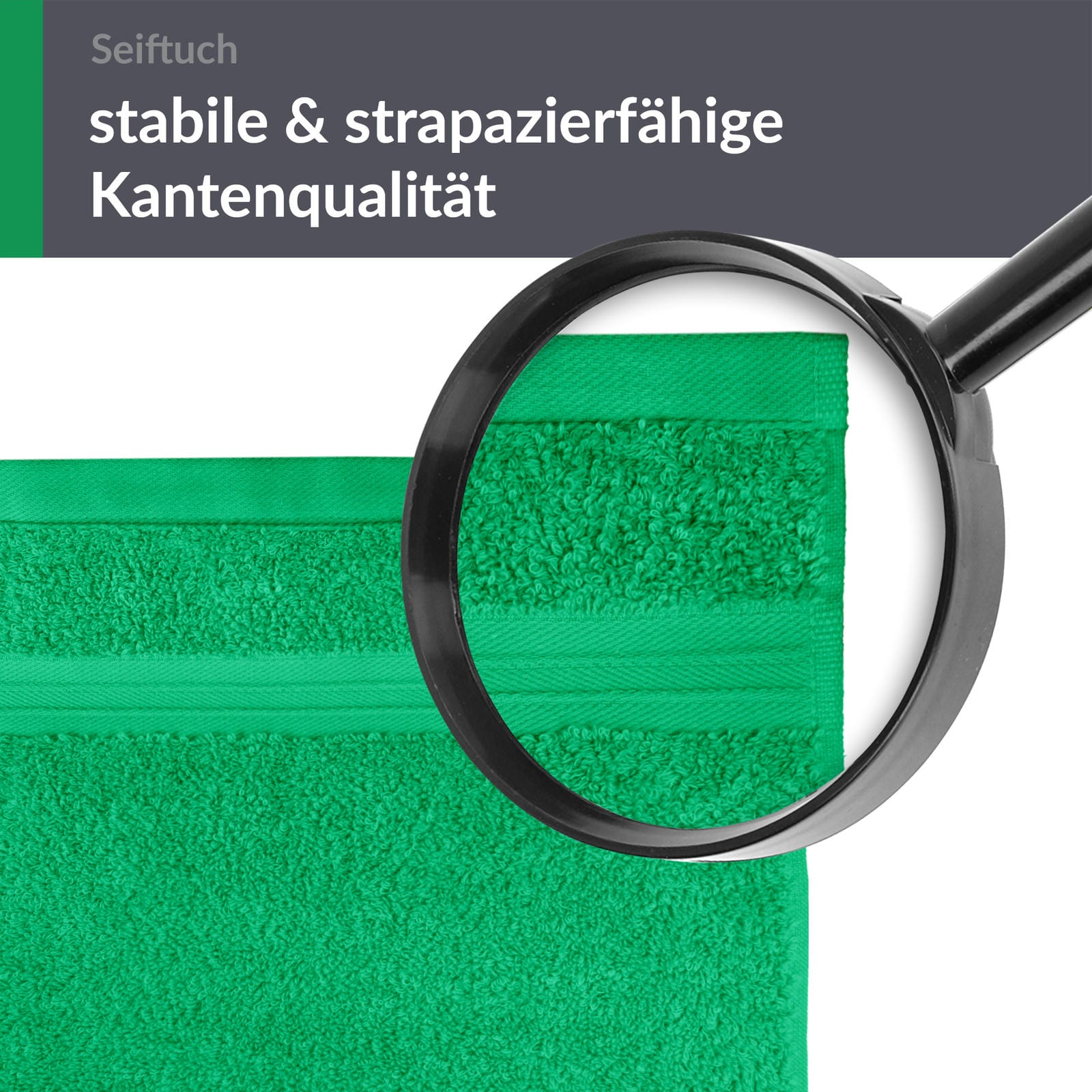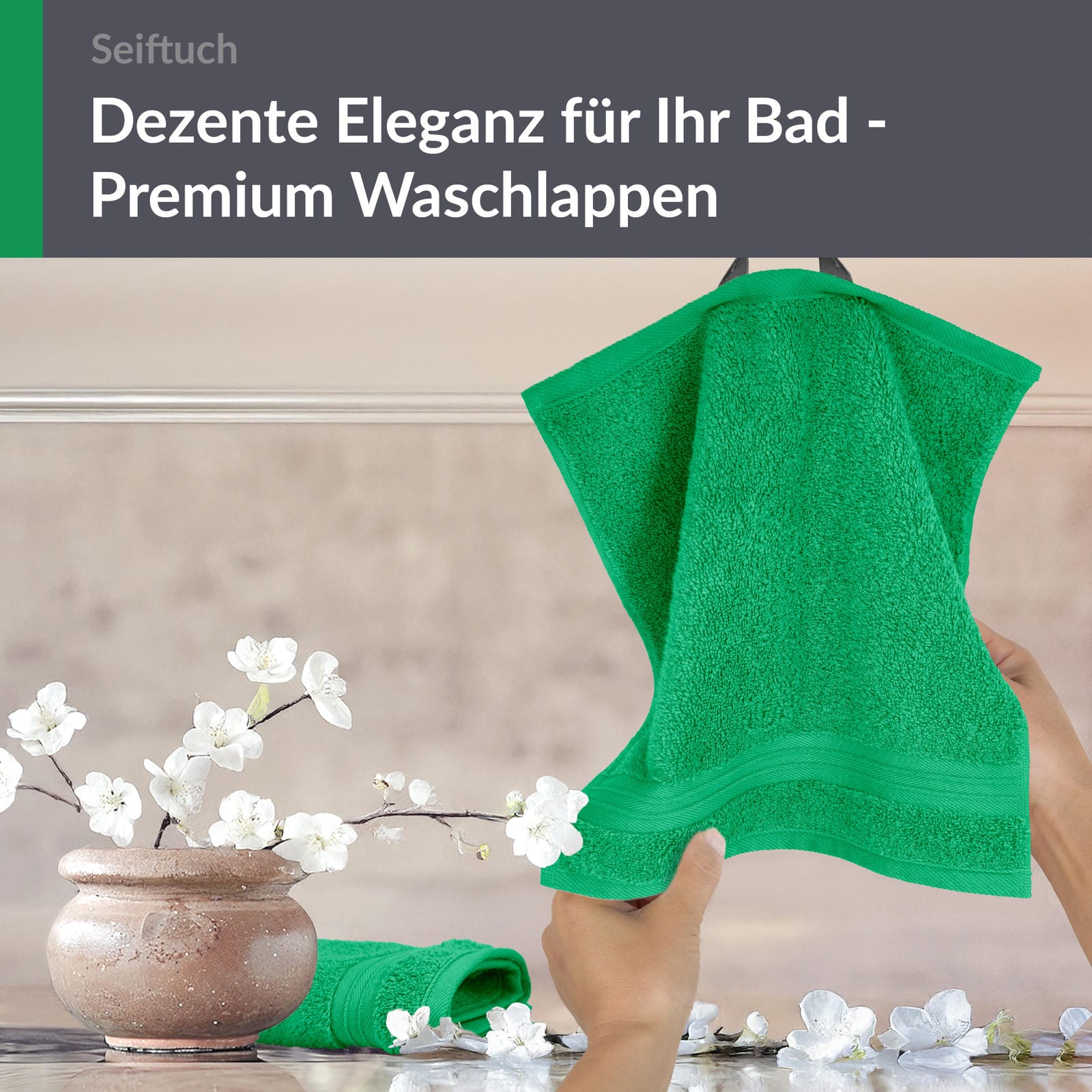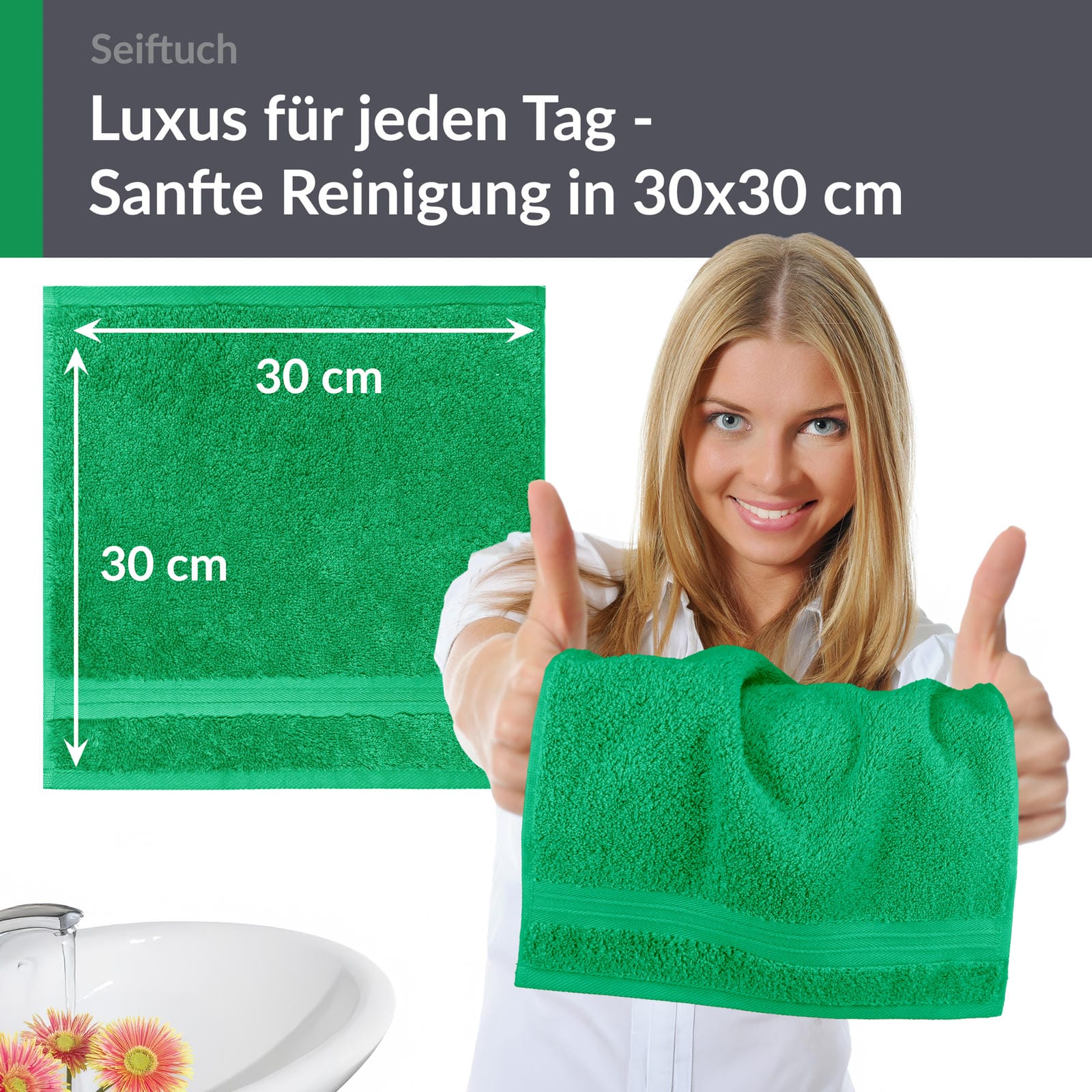 Egal ob im Gäste WC, Badezimmer oder in der Reisetasche. Unsere grünen Gästehandtücher ca. 30x30 cm sind überall ein echter Blickfang.