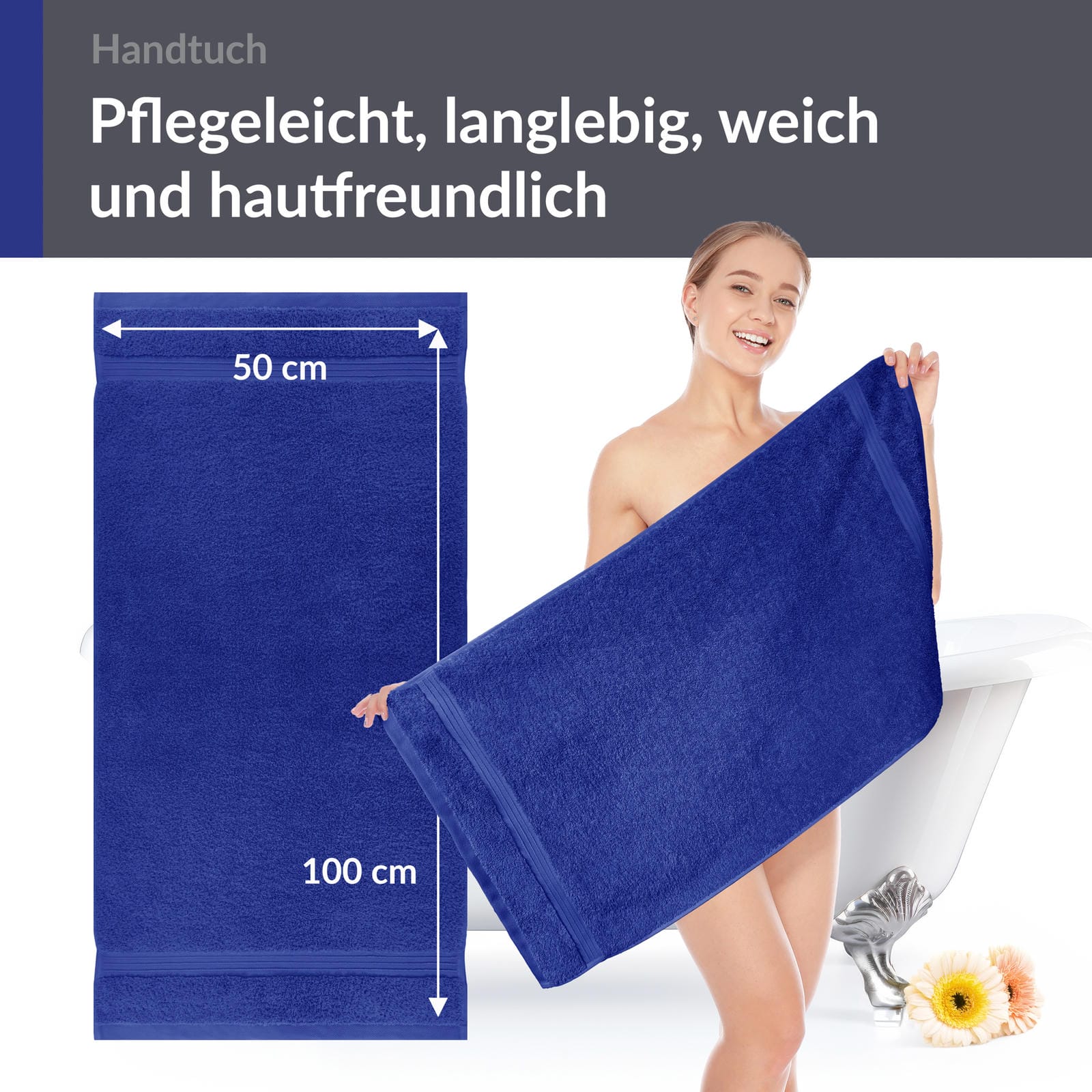 Vielseitiges Handtuchset ca. 50x100 cm im 2er Sparset! Nutzen Sie die blauen Baumwolltücher als kuschelige Fitnesshandtücher oder Badezimmer Handtücher.