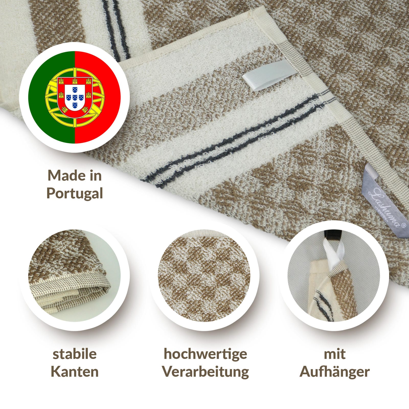 Farbüberschuss: Lashuma Handtücher sind nicht vorgewachsen. In den ersten 2–3 Wäschen kann überschüssige Farbe austreten. Bitte immer mit ähnlichen Farbtönen waschen.