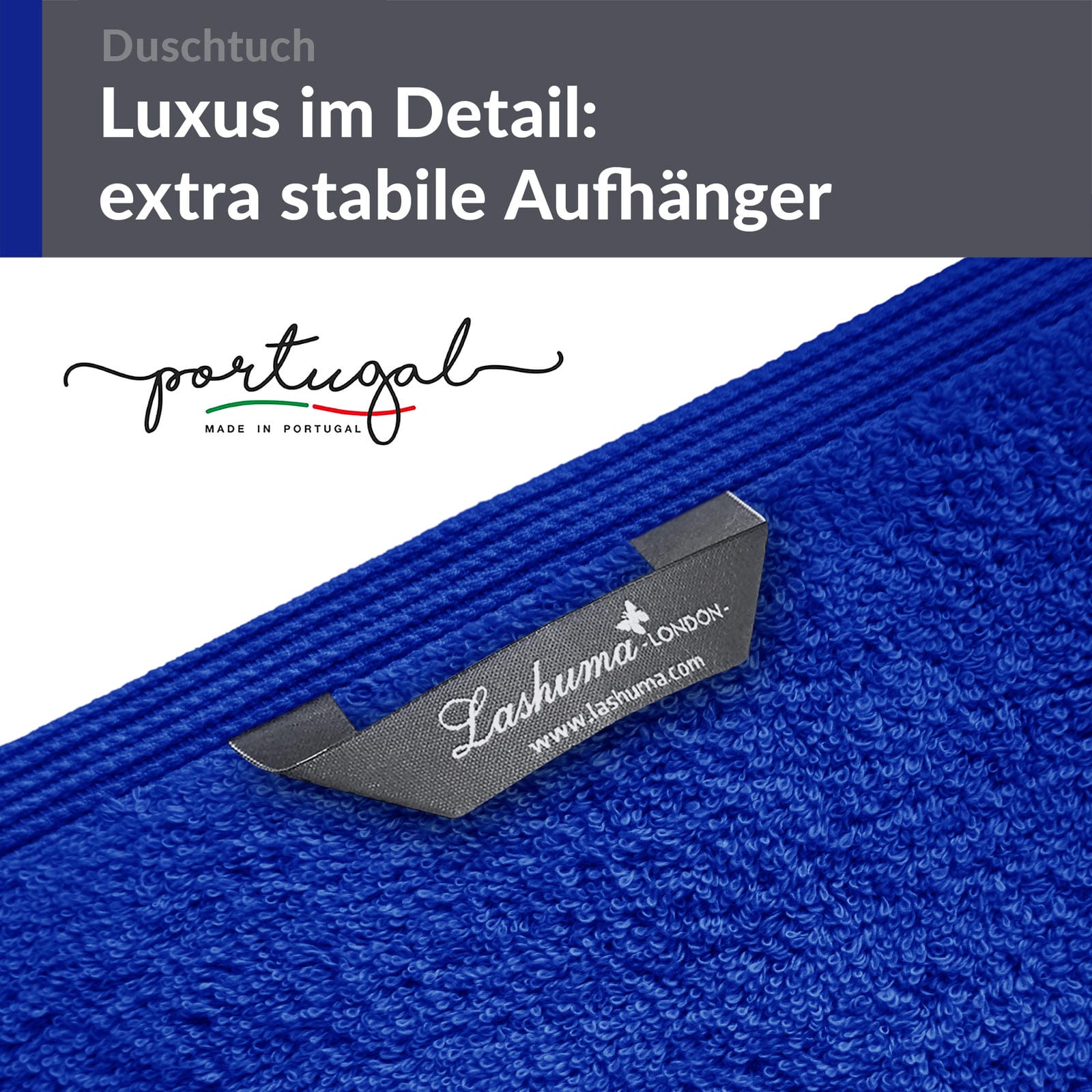 Gefertigt in Portugal, steht das Lashuma Duschtuch für traditionelle Handwerkskunst und eine Qualität, die auch nach zahlreichen Waschgängen erhalten bleibt. Die robuste Verarbeitung garantiert, dass das Handtuch seine Form und Farbe behält, während die weiche Frottee-Struktur für ein luxuriöses Hautgefühl sorgt. Die praktische Hängeschlaufe erleichtert die Aufbewahrung und sorgt dafür, dass das Handtuch schnell trocknet.