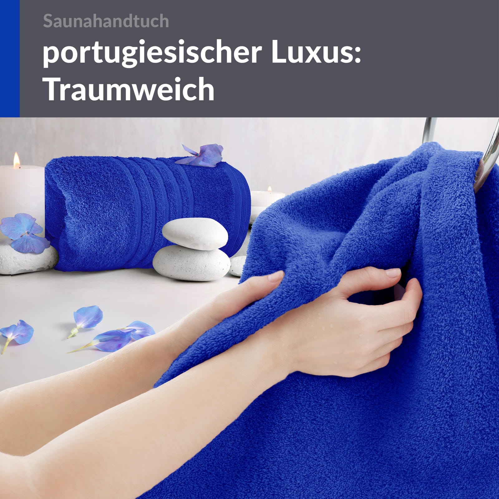 PREMIUM QUALITÄT: In Portugal gefertigt, kombiniert das 80x200 cm große Saunahandtuch erstklassige Verarbeitung mit reiner Baumwolle und einer zeitlosen Eleganz, die für entspannende Wellness Momente sorgt.