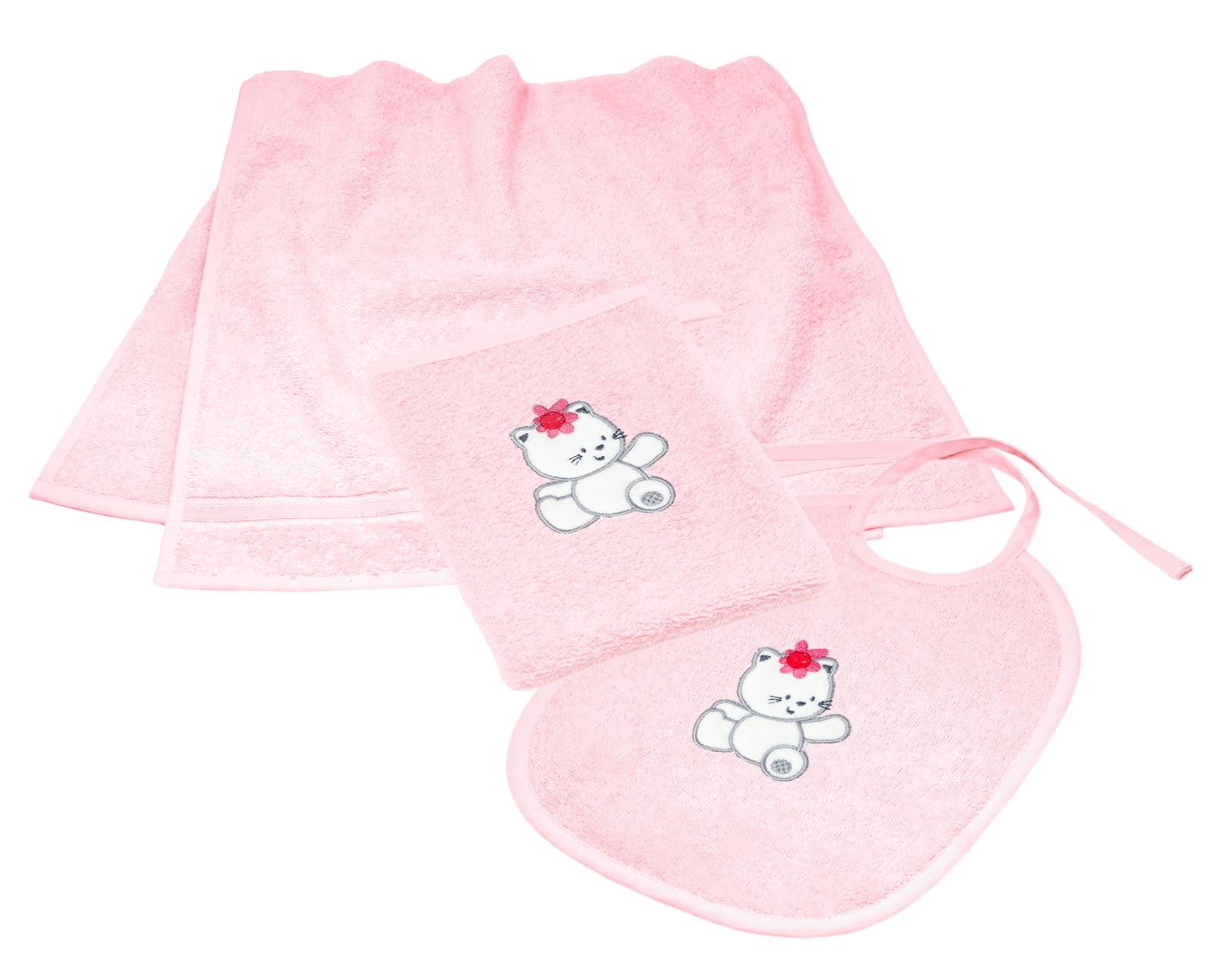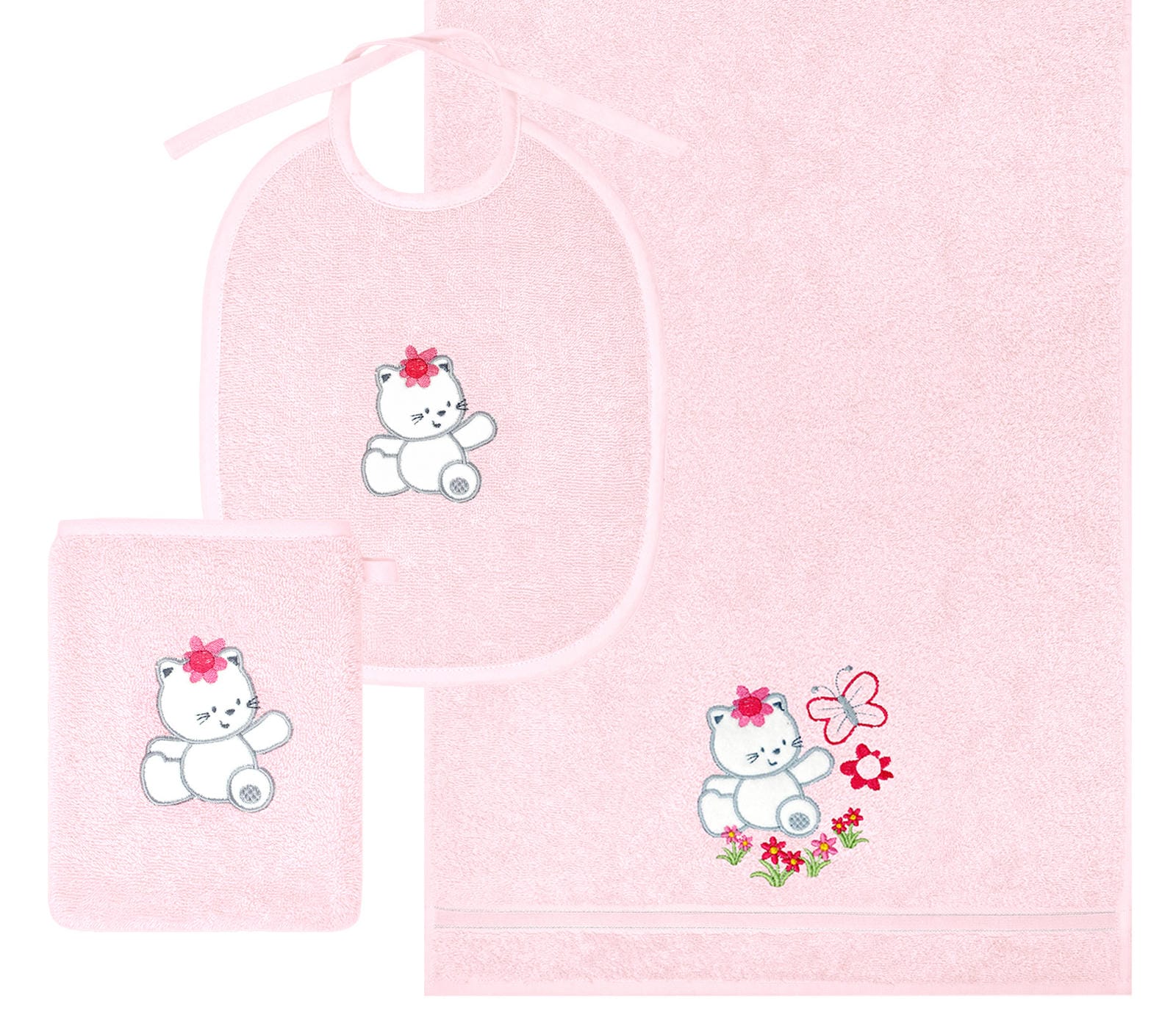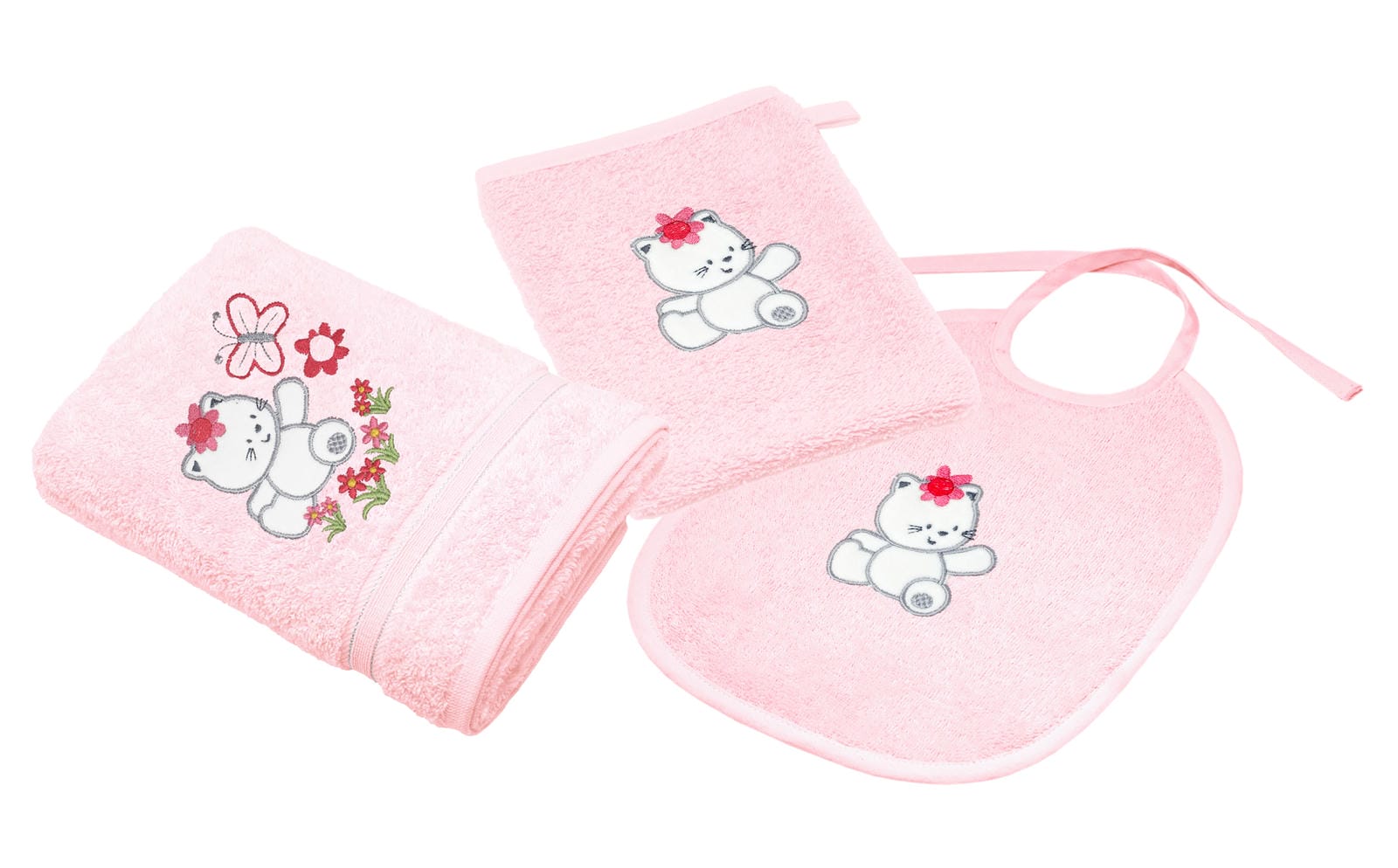 3er Set Baby Geschenkset für Mädchen und Jungen bestickt mit Katze - Rosa