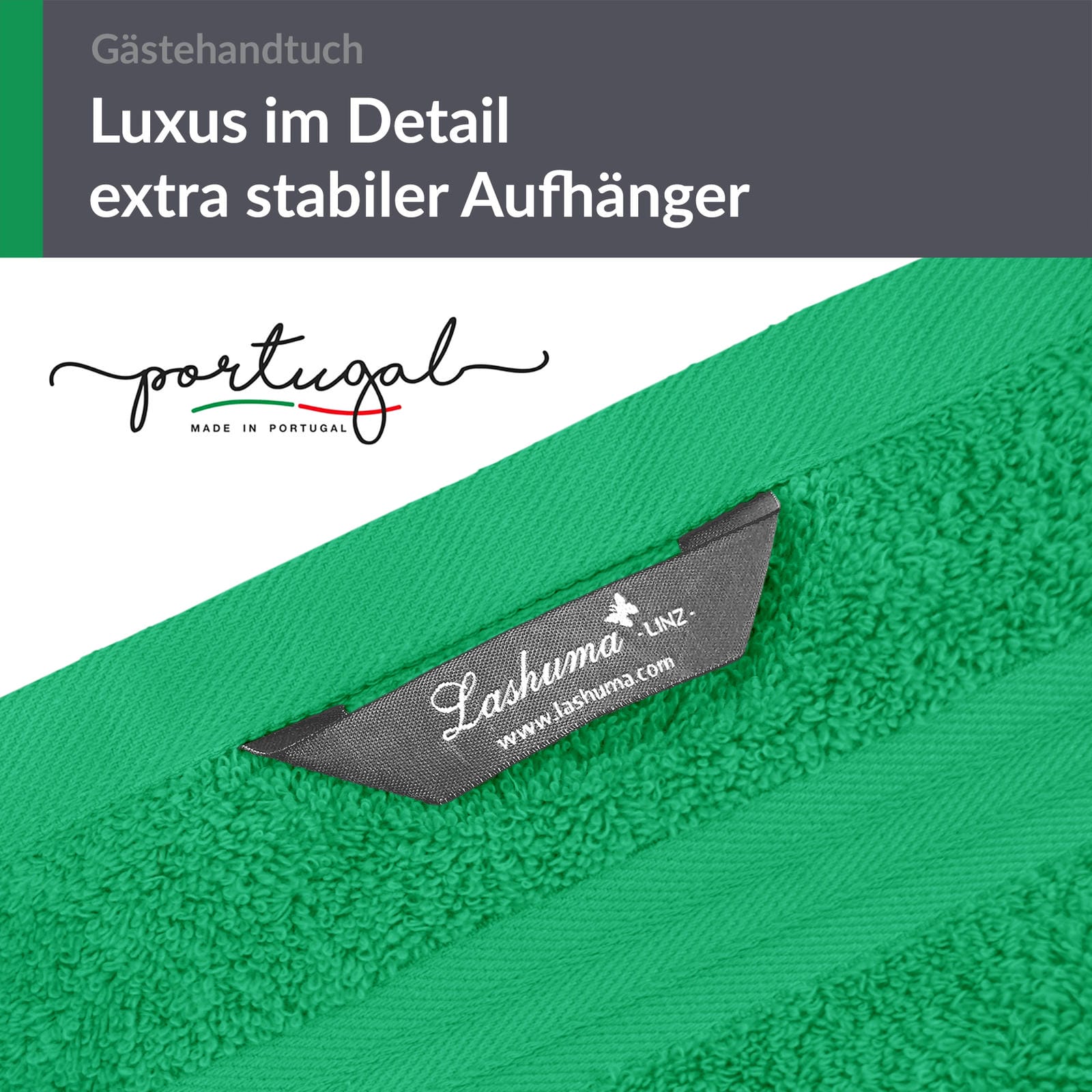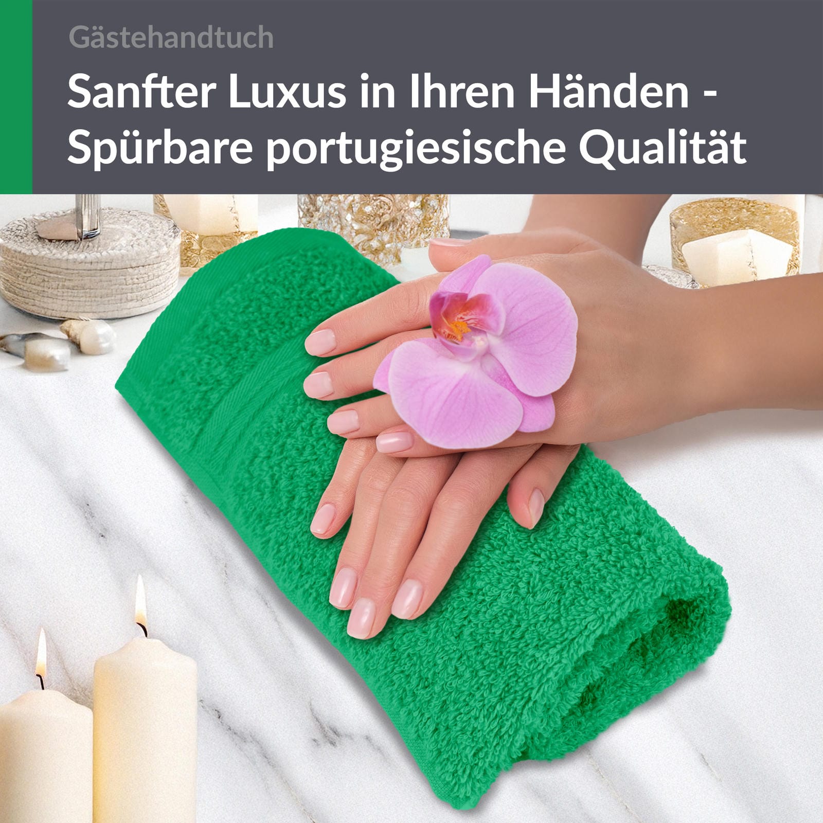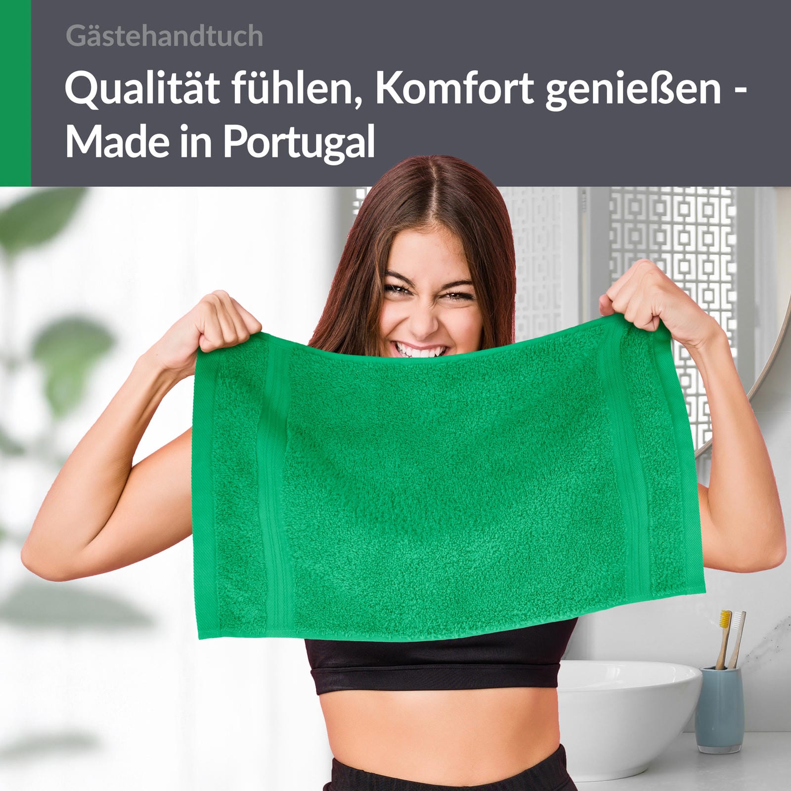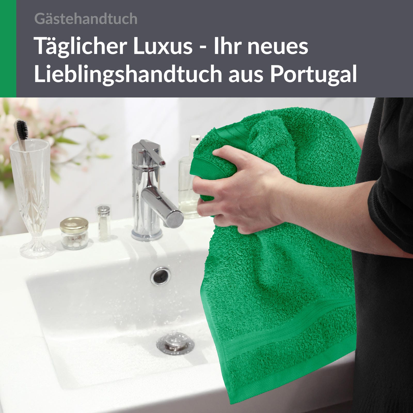 Kuschelig weich umhüllt unser grünes Gästehandtuch aus feinstem Frottee Ihre Haut. Dank der Qualität 550 g/qm nimmt das robuste Handtuch schnell Feuchtigkeit auf.