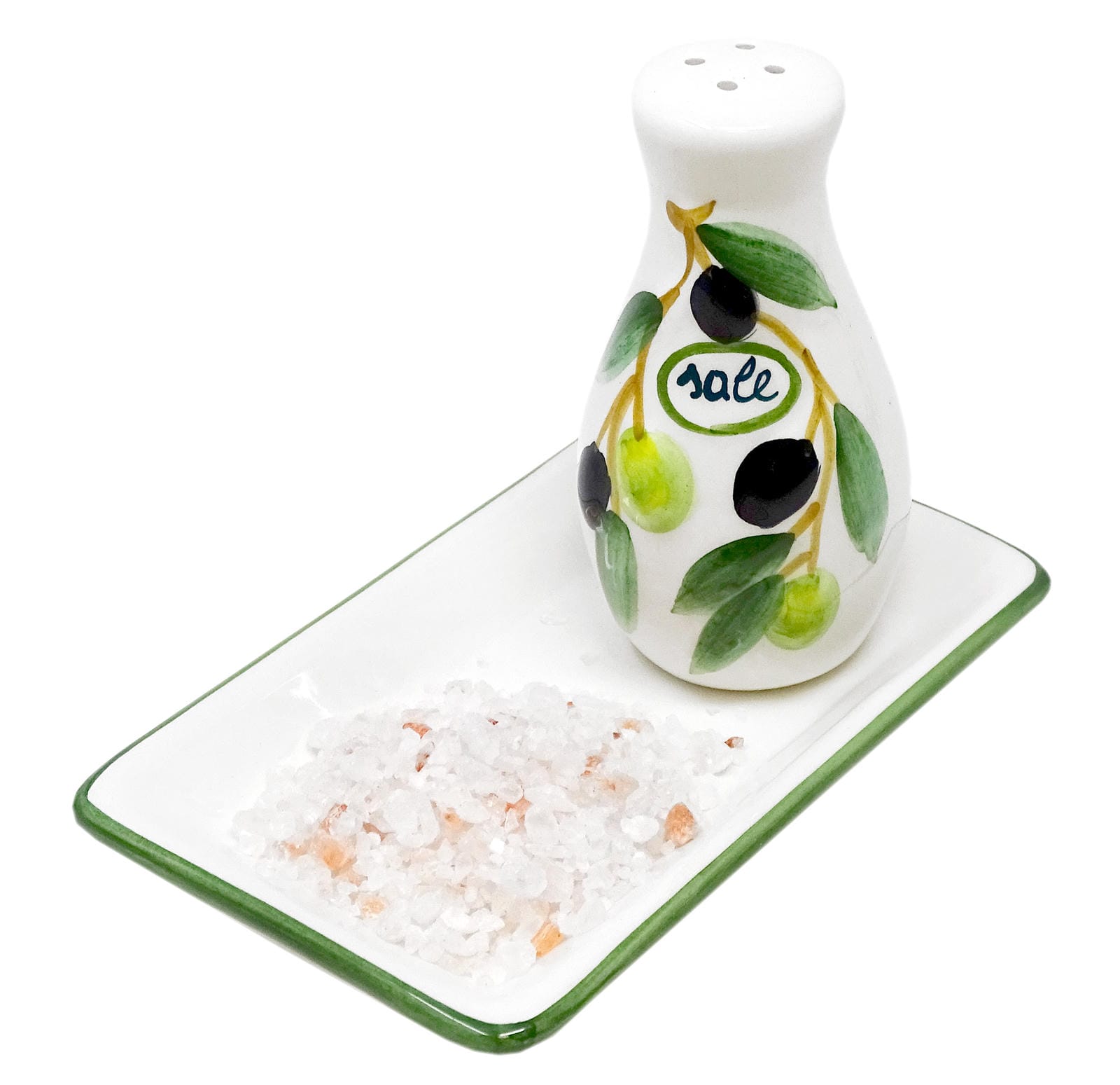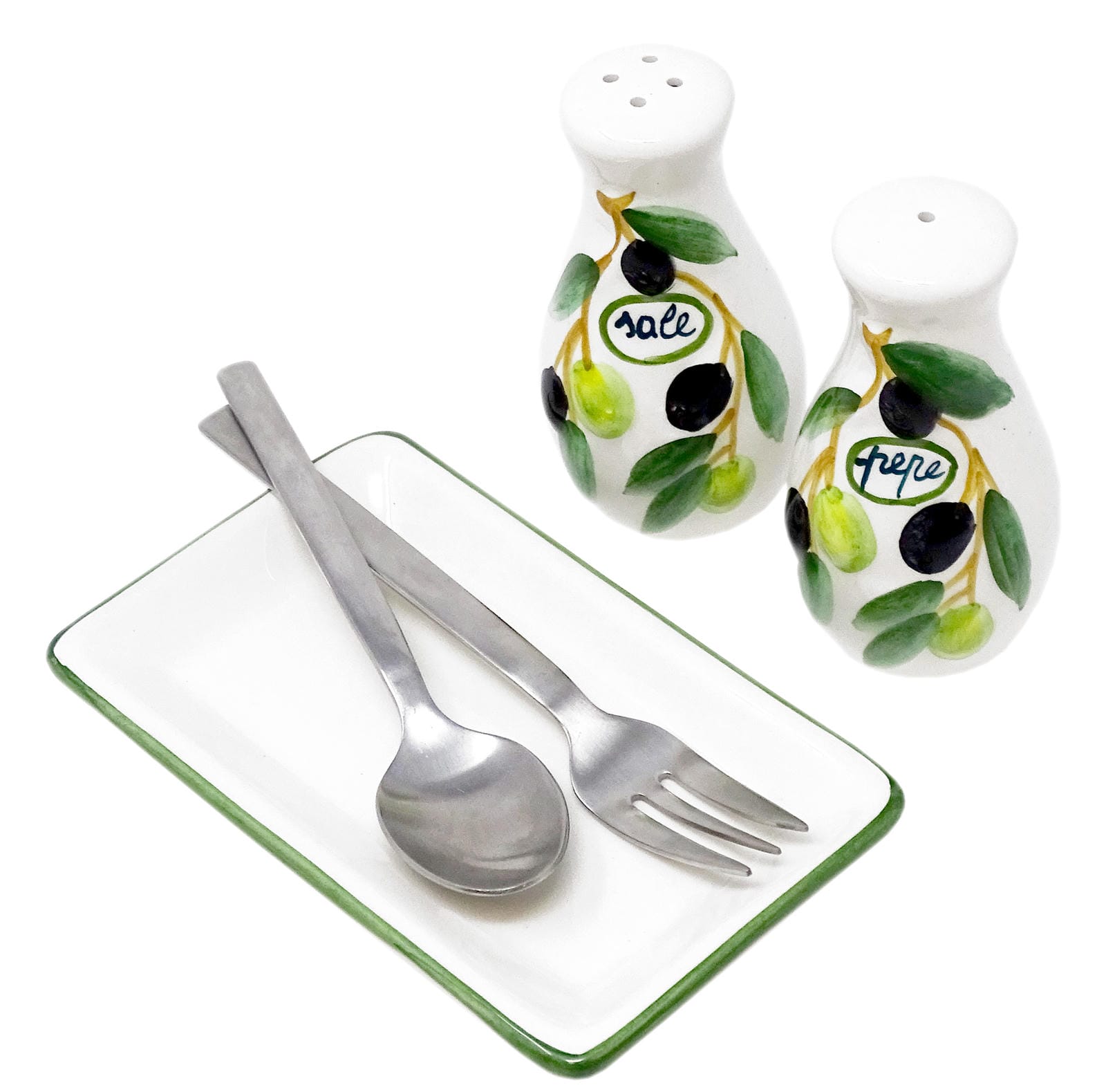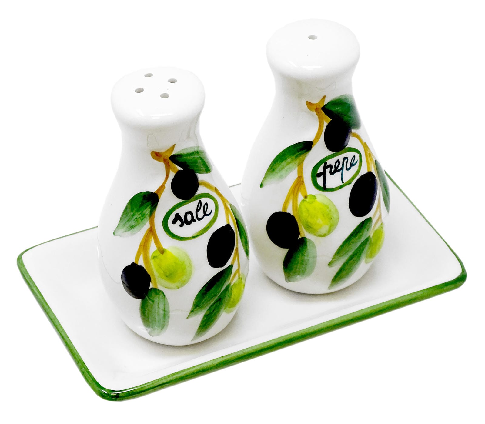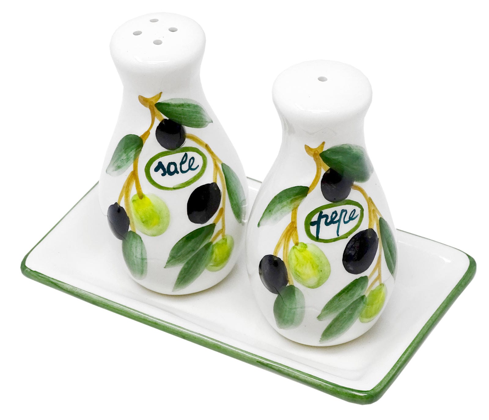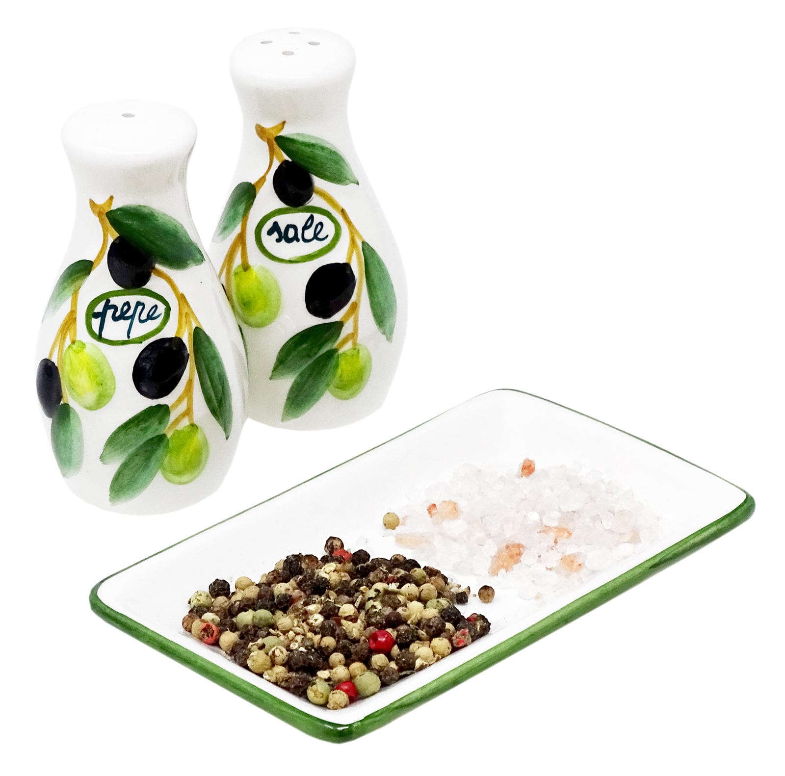 Handgemachter Salzstreuer und Pfefferstreuer aus Italienischer Keramik, 3-teilig im Olivendesign mit Tablett, Größe 14x8 cm