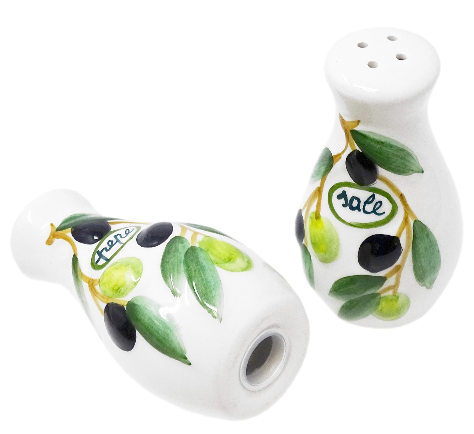 Dekoriert sind die Salz - und Pfefferstreuer mit einem Relief in Form eines Oliven Zweiges mit Blättern und Früchten. Das Olivenrelief auf jedem Gewürz Spender ist handbemalt und jeder Streuer ist mit dem italienischen Wort für Salz bzw. Pfeffer beschriftet. Auf dem Salzstreuer steht: Sole, der Pfefferstreuer wurde mit pepe beschriftet. Somit steht Salz und Pfeffer auf den Gewürzstreuern, nur eben auf Italienisch. Genau so soll es auch sein, denn die Salz - und Pfefferstreuer bringen mediterranes Flair in Ihre Küche.