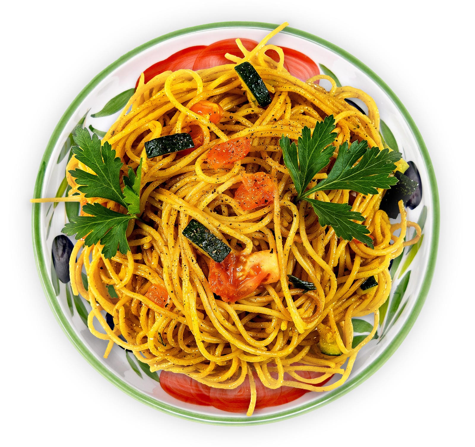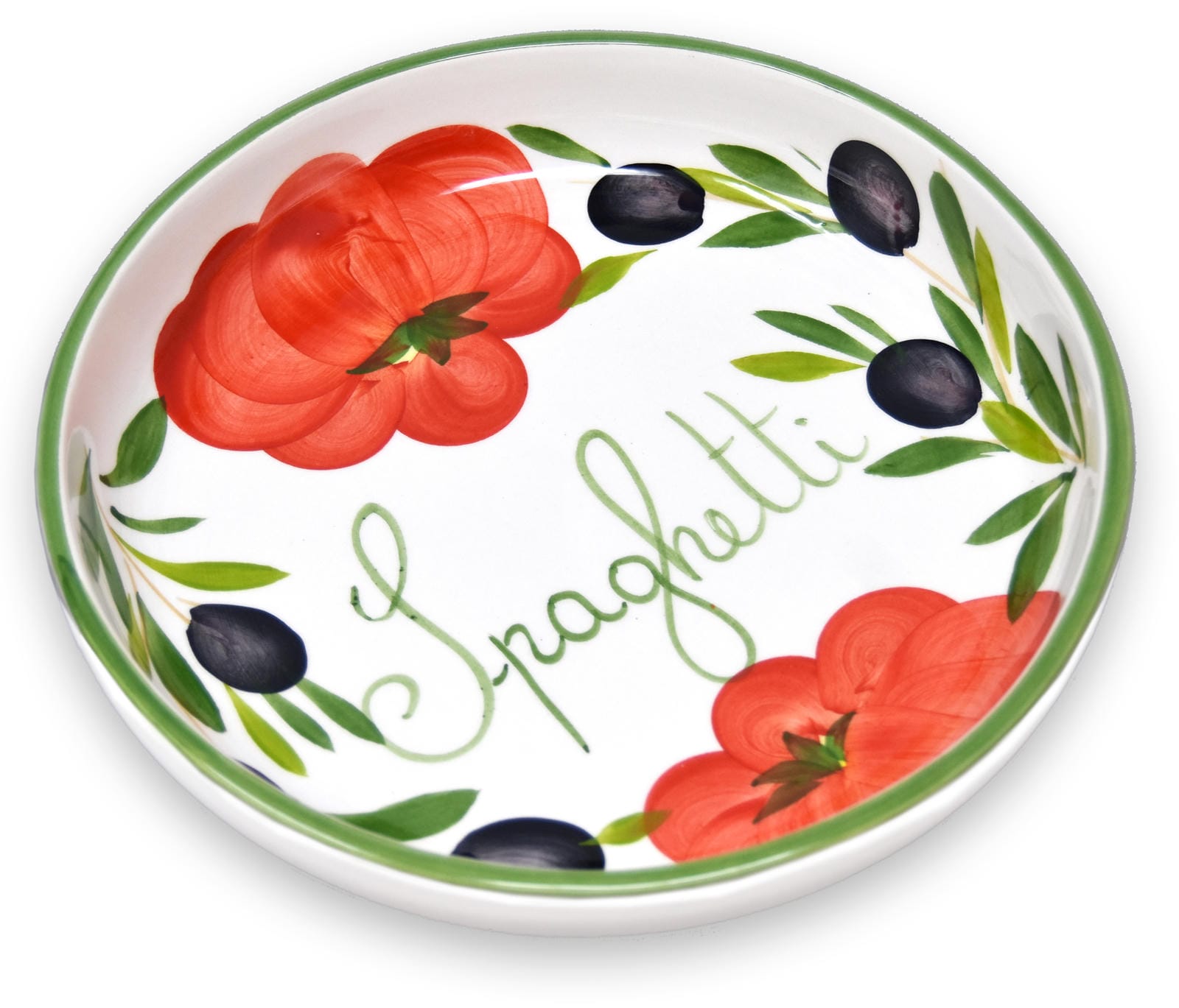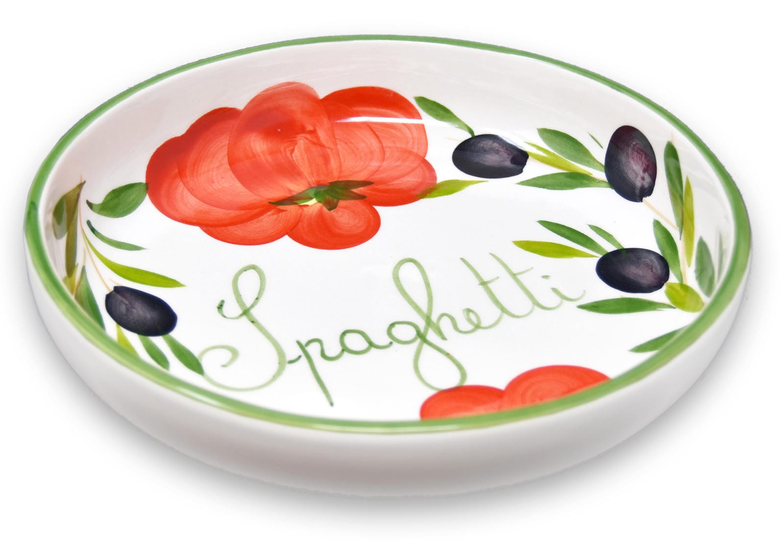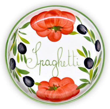 🍜 Der Schriftzug Spaghetti macht diese Salatschüssel zu etwas Besonderem. Aufgemalte Tomaten und Oliven auf dem weißen Keramikteller wirken besonders dekorativ.