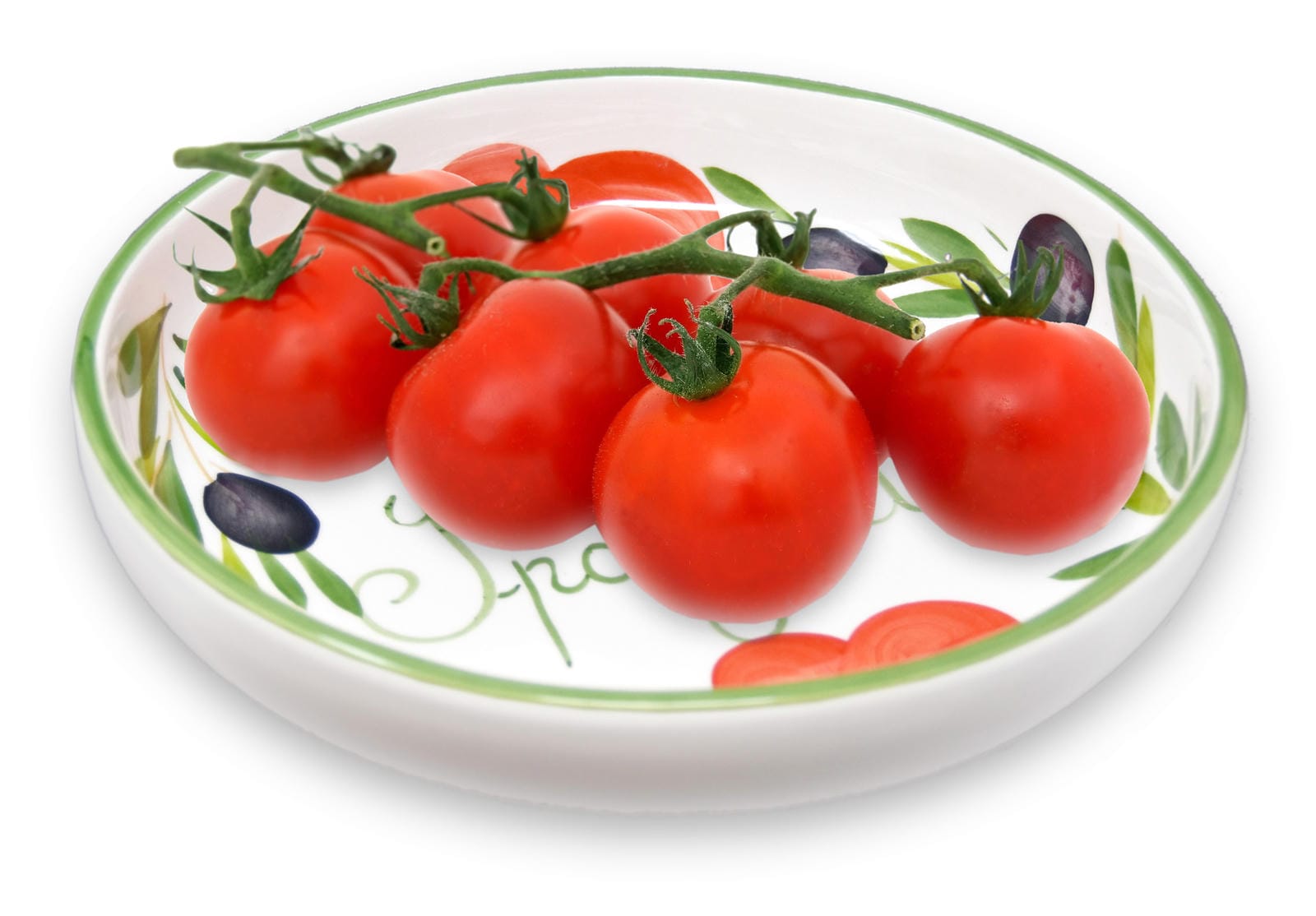 Flache Nudelschüssel aus Italienischer Keramik, Servierschale Tomaten - Oliven Design, Runde Pastaschüssel 22 cm, Tief 3 cm