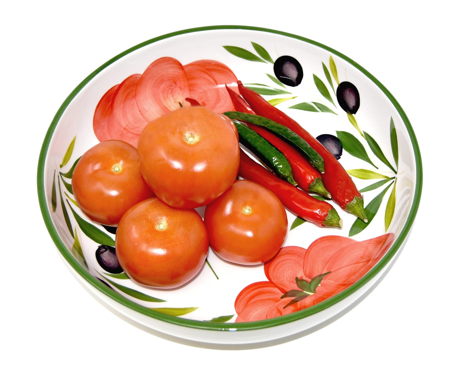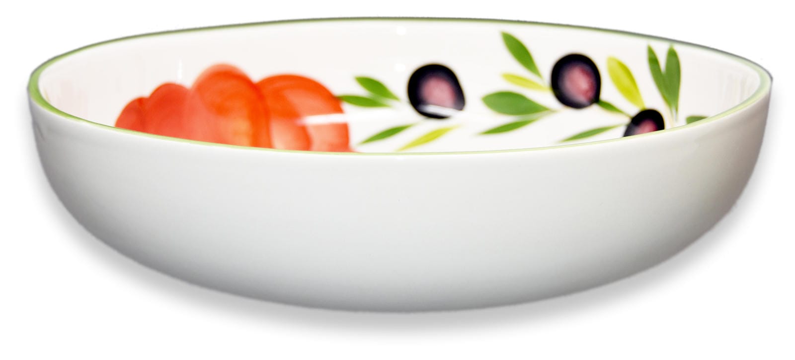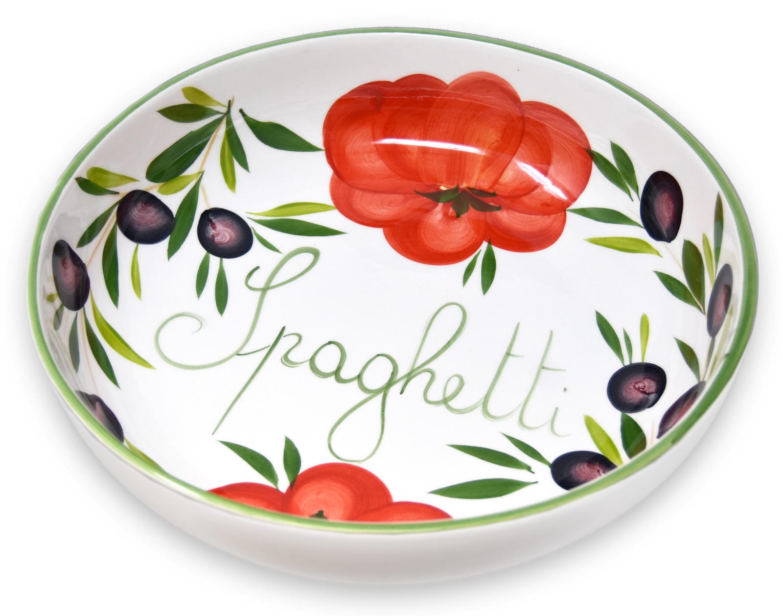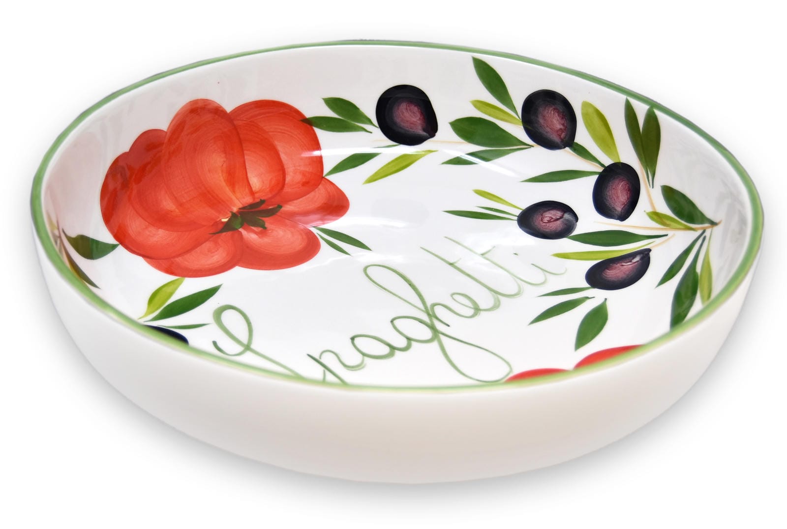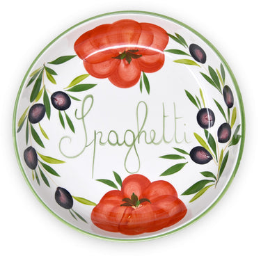 🍜 Die aufgemalten Tomaten und Oliven verleihen dem Servierteller einen dekorativen Charakter. Auf dem Boden der Salatschüssel befindet sich der Schriftzug Spaghetti.
