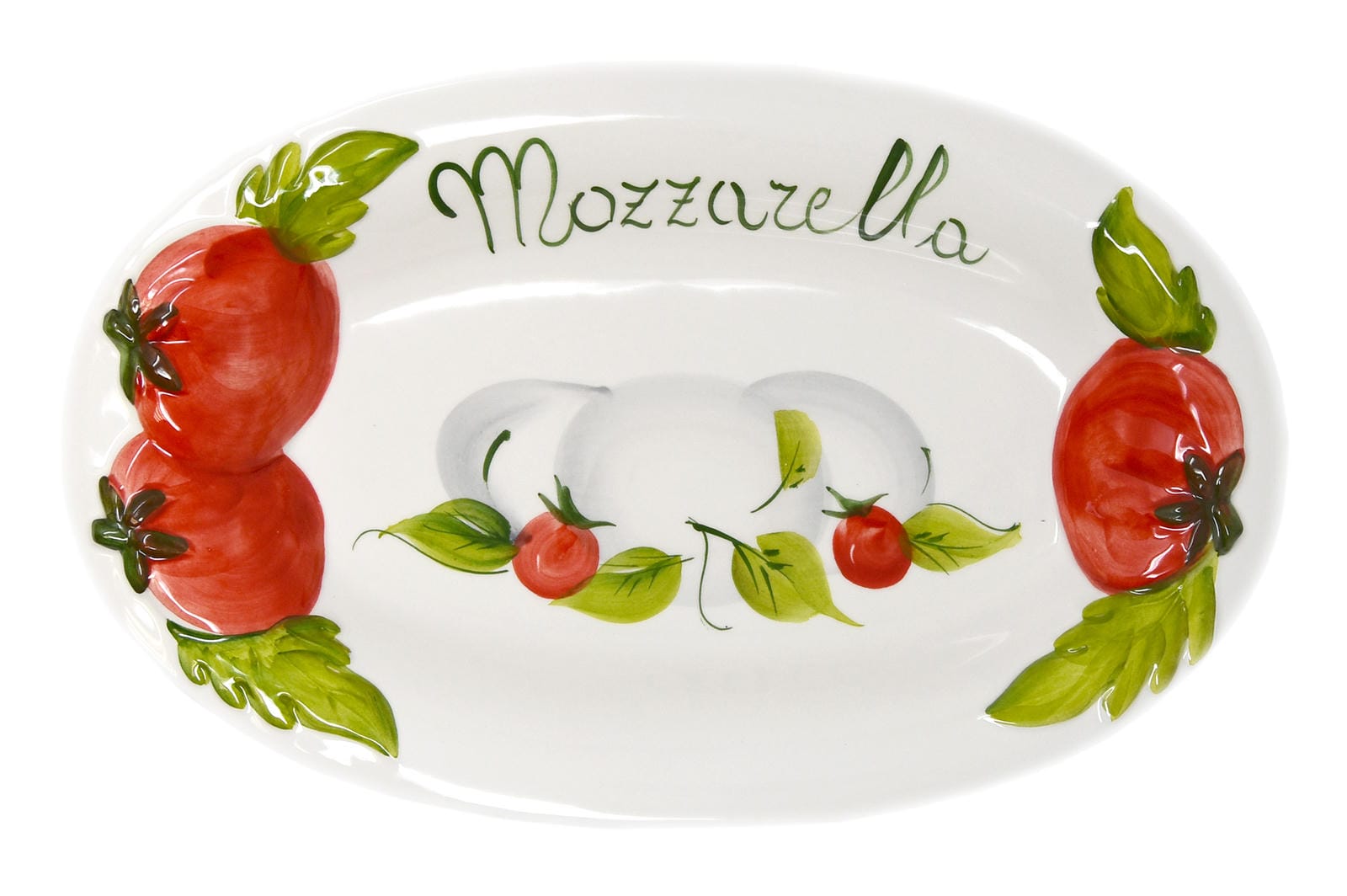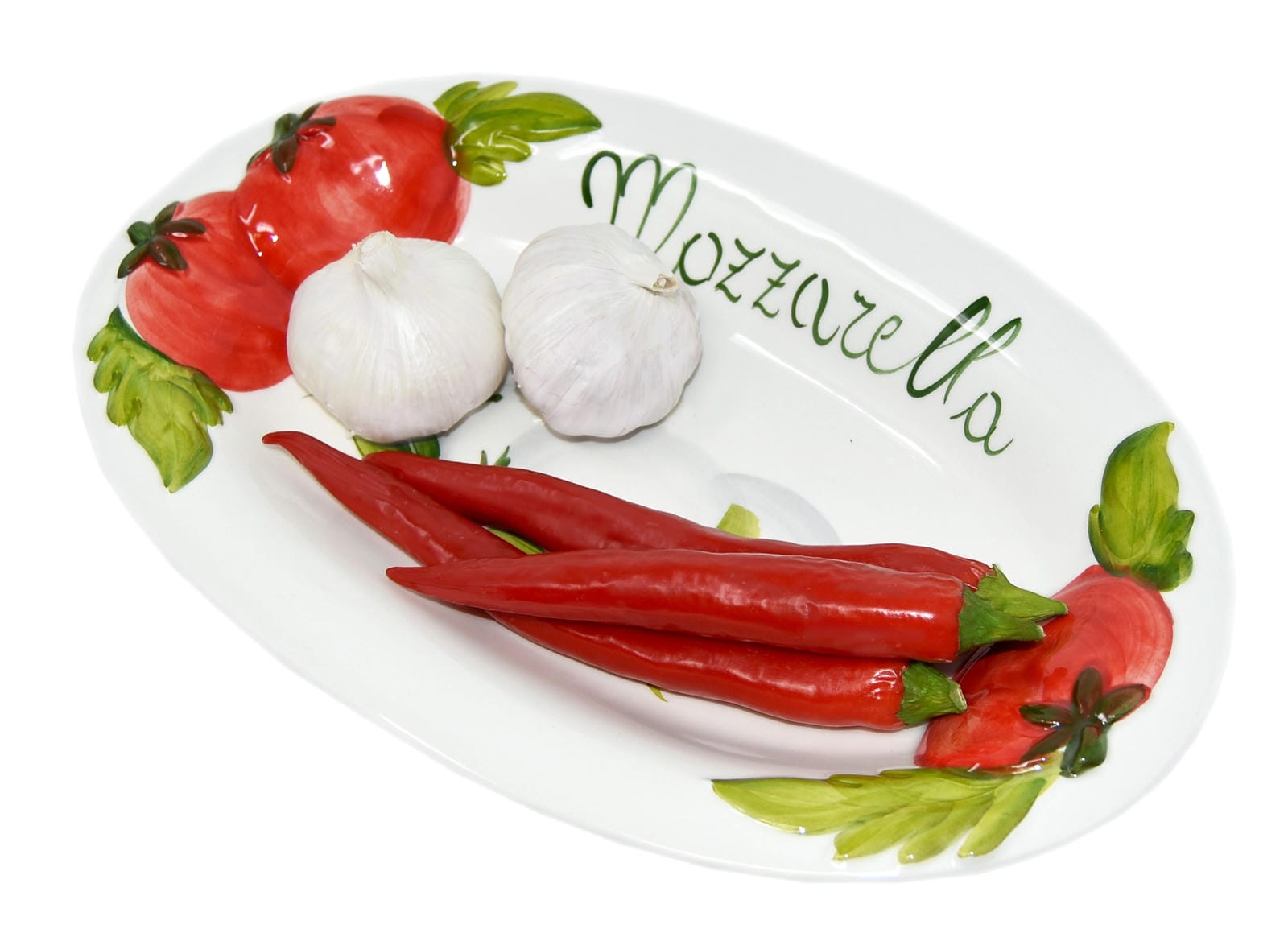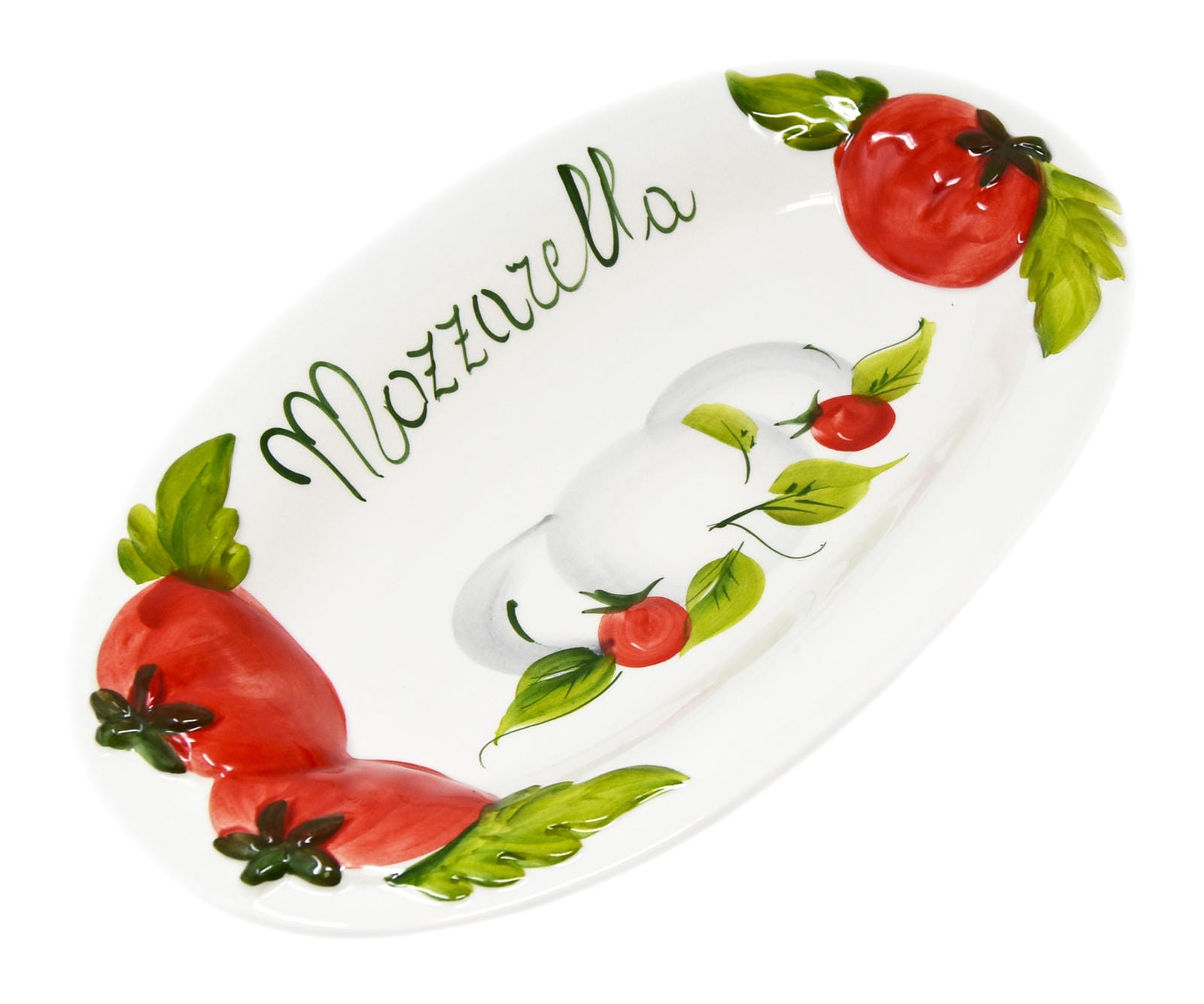Handgemachte Ovale Servierplatte im Tomate Mozzarella Design aus Italienischer Keramik, Servierteller 31x20 cm, 3 cm tief