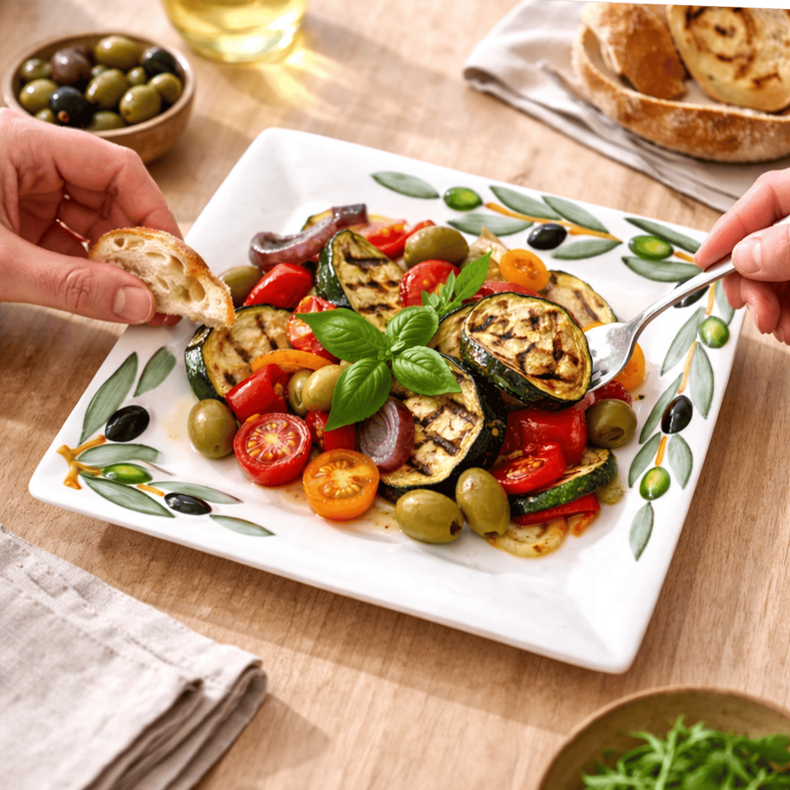 🫒 Unser quadratischer Service Teller als Blickfang auf jedem Tisch! Die reizende Relief Verzierung auf dem mediterran anmutenden Deko Geschirr ist besonders auffällig.