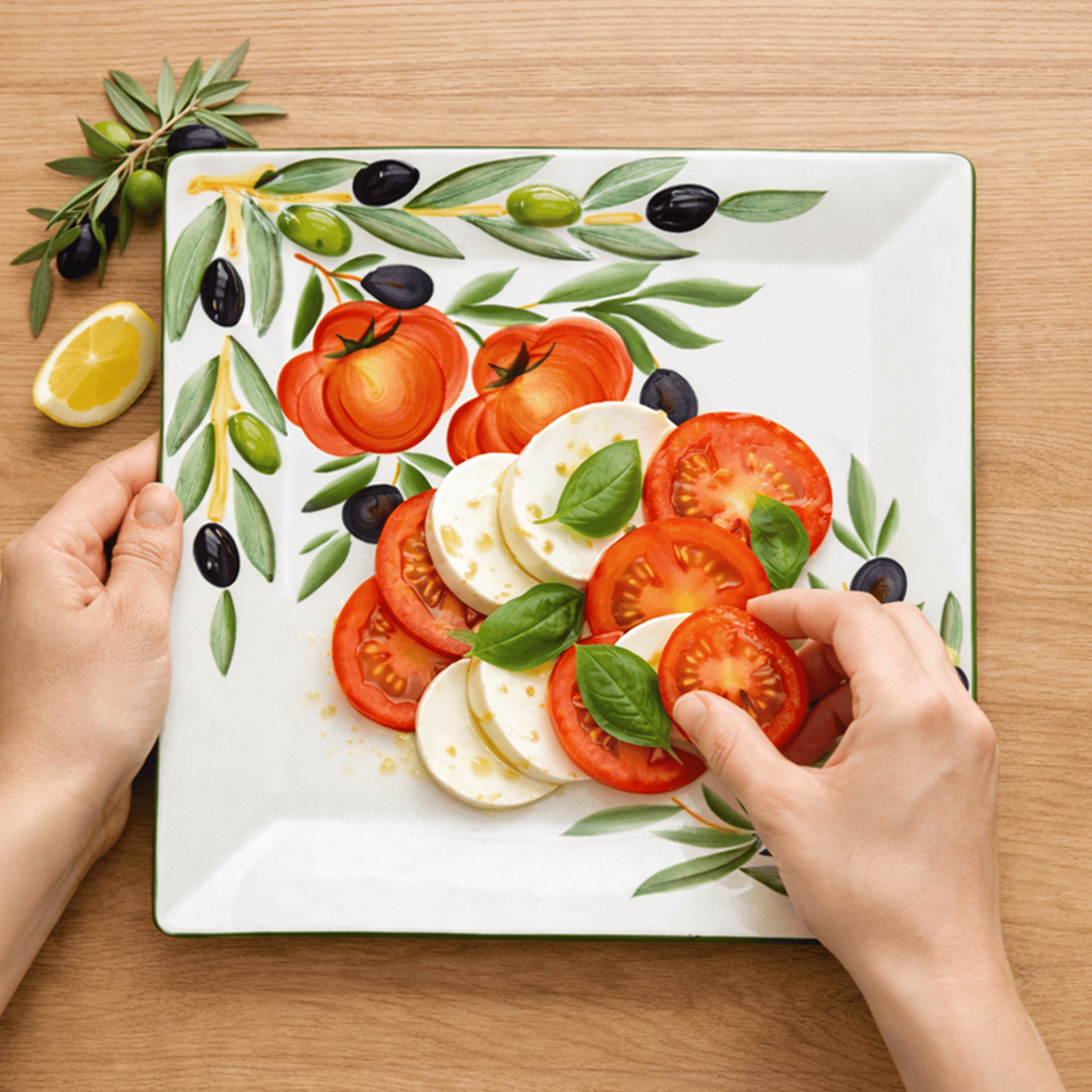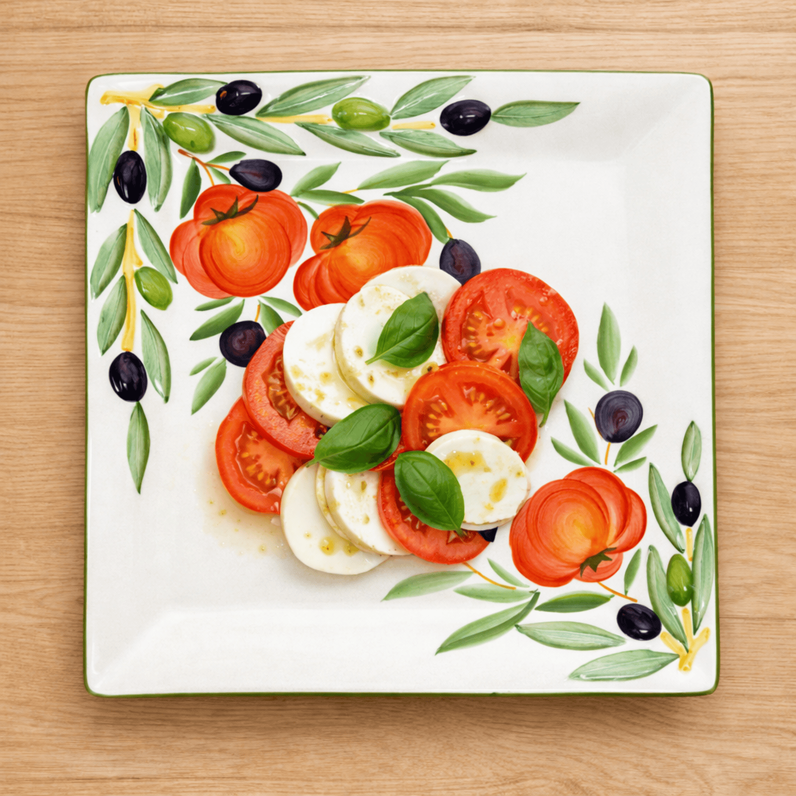 Eckige Aufschnittplatte Keramik, Handgemachter Servierteller 27x27 cm, Gourmetplatte Design: Tomate Olive