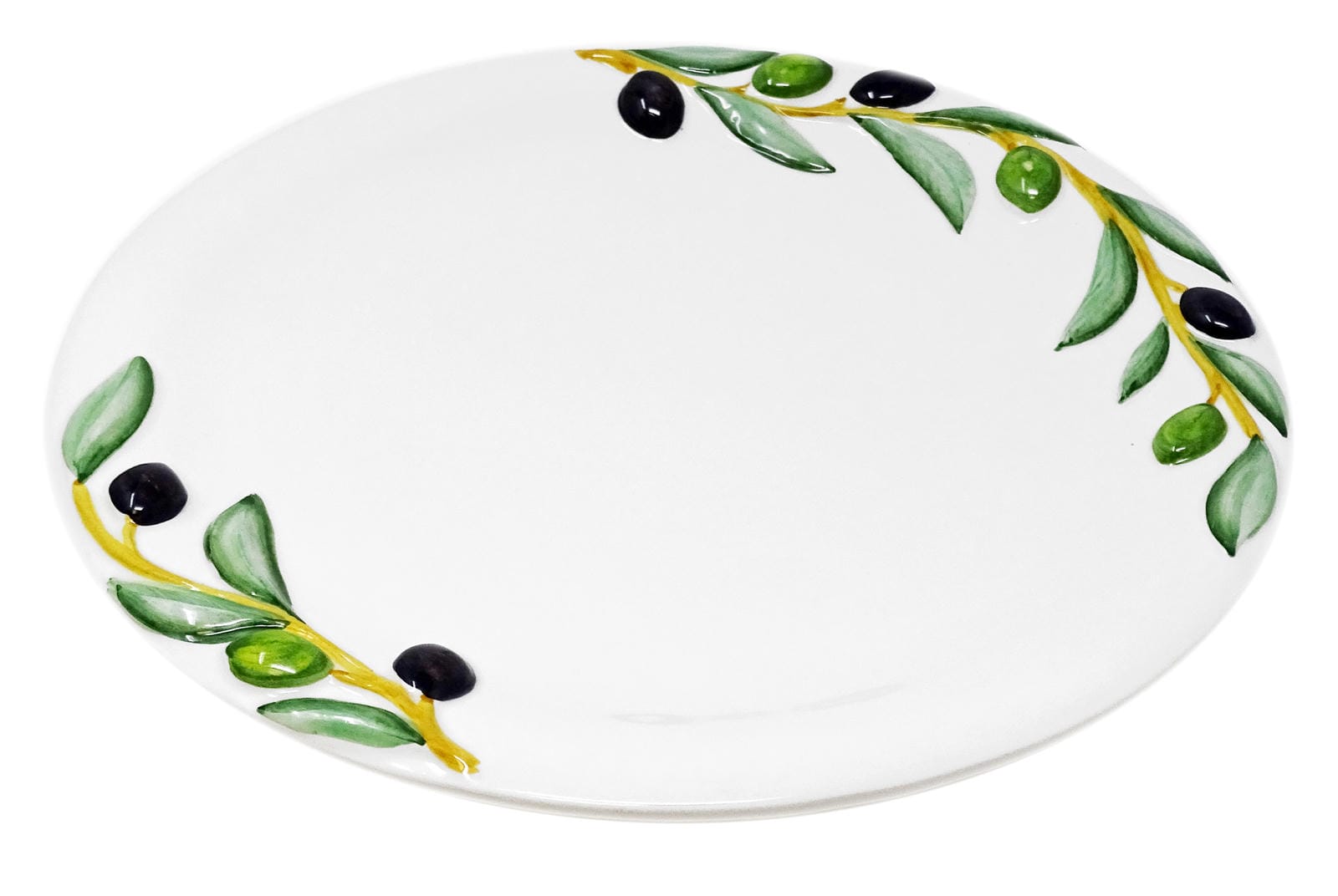 Die schmückende Optik erhält der hochwertige Keramikteller durch das Oliven Reliefdekor. Zelebrieren Sie Ihr Essen, wie es es unsere italienischen Freunde tun und decken Sie die Festtagstafel mit passenden Speise Tellern mit Oliven Motiv. Leckeres Oliven Brot mit Ricotta, Schnittchen mit Leberwurst oder ein köstliches Pasta Gericht machen auf diesem Essteller immer eine gute Figur. Ihre Familie wird begeistert von dieser weißen Servierplatte sein, die wunderschön von Hand gearbeitet und bemalt ist.