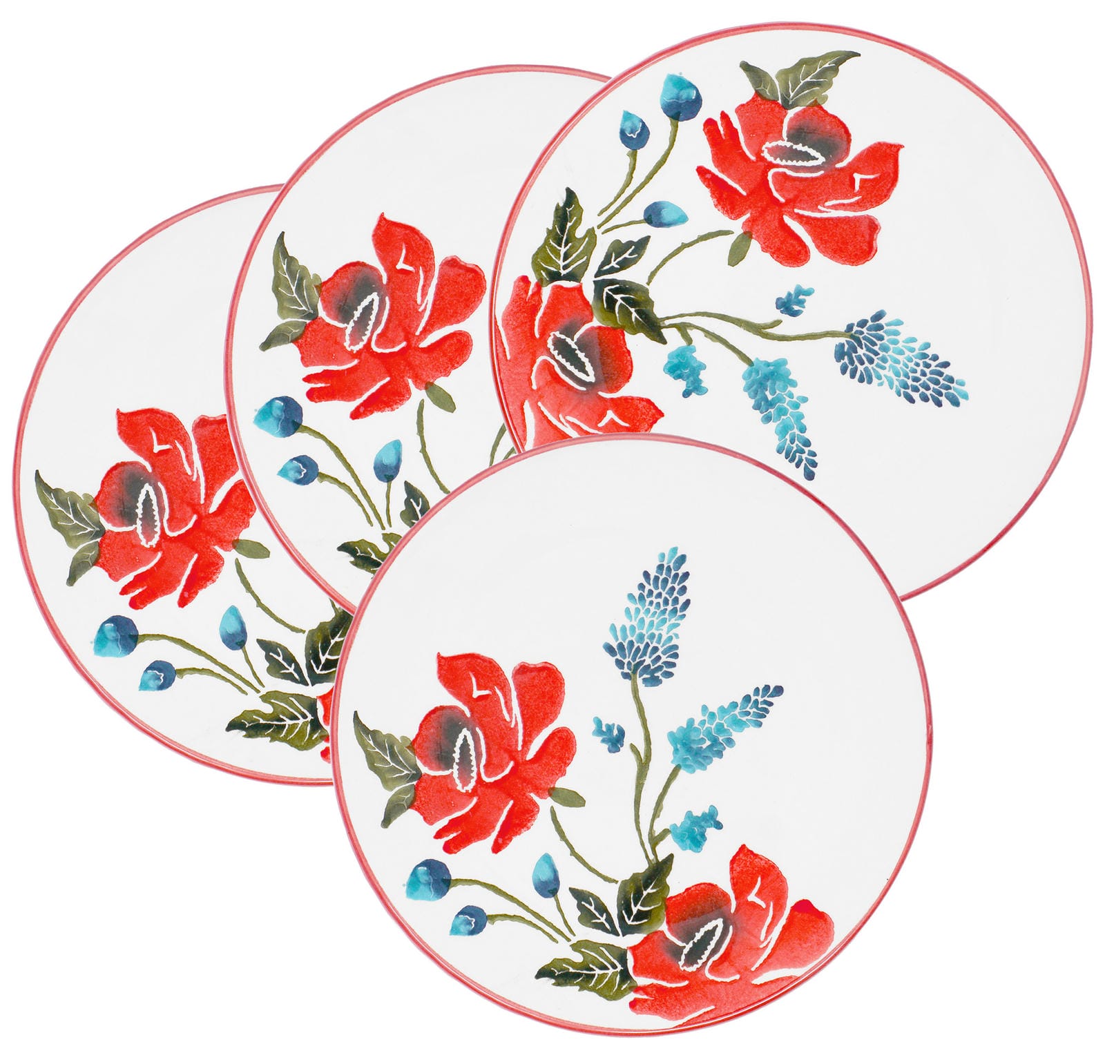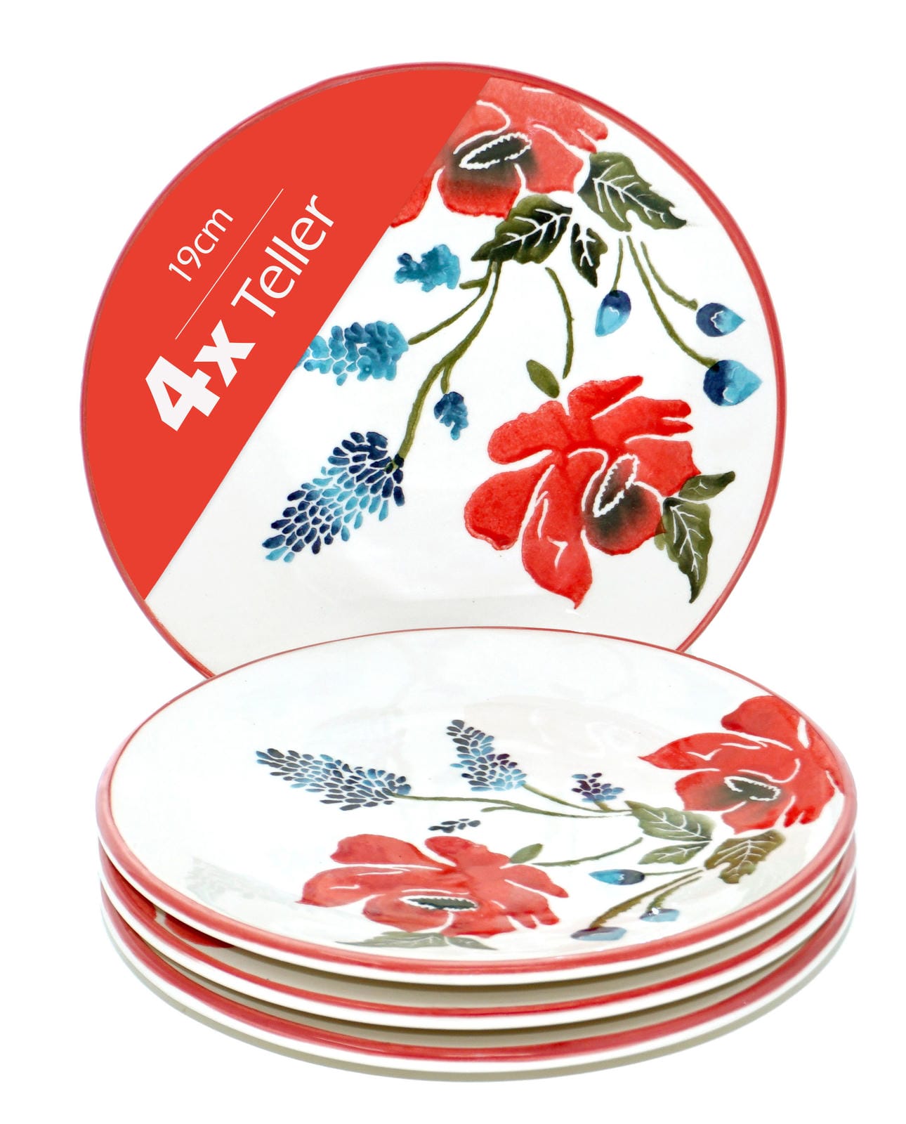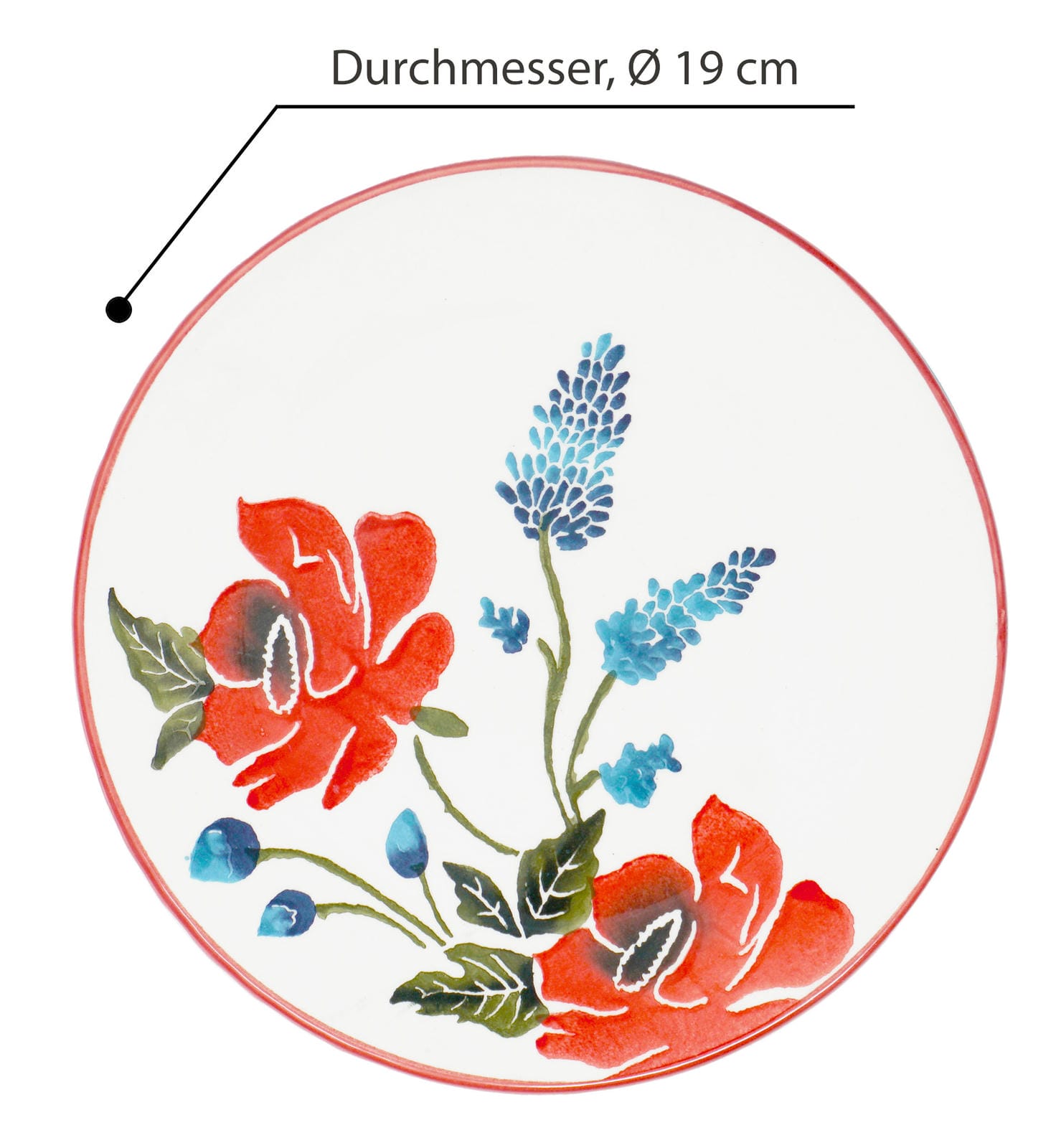 Essteller 4er Set rund, Keramik Frühstücksteller 19 cm Ø, Abendbrotteller bunt Mohnblume