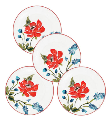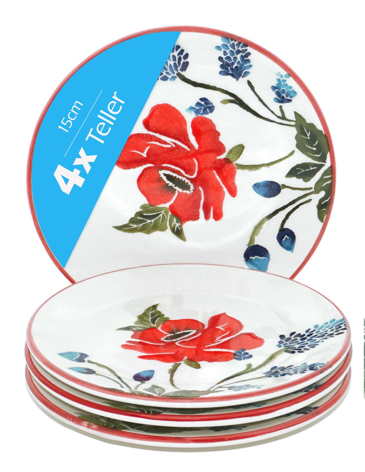 Frühstücksteller 4er Set, flache Kuchenteller bunt Mohnblume, Keramikteller rund 15 cm Ø
