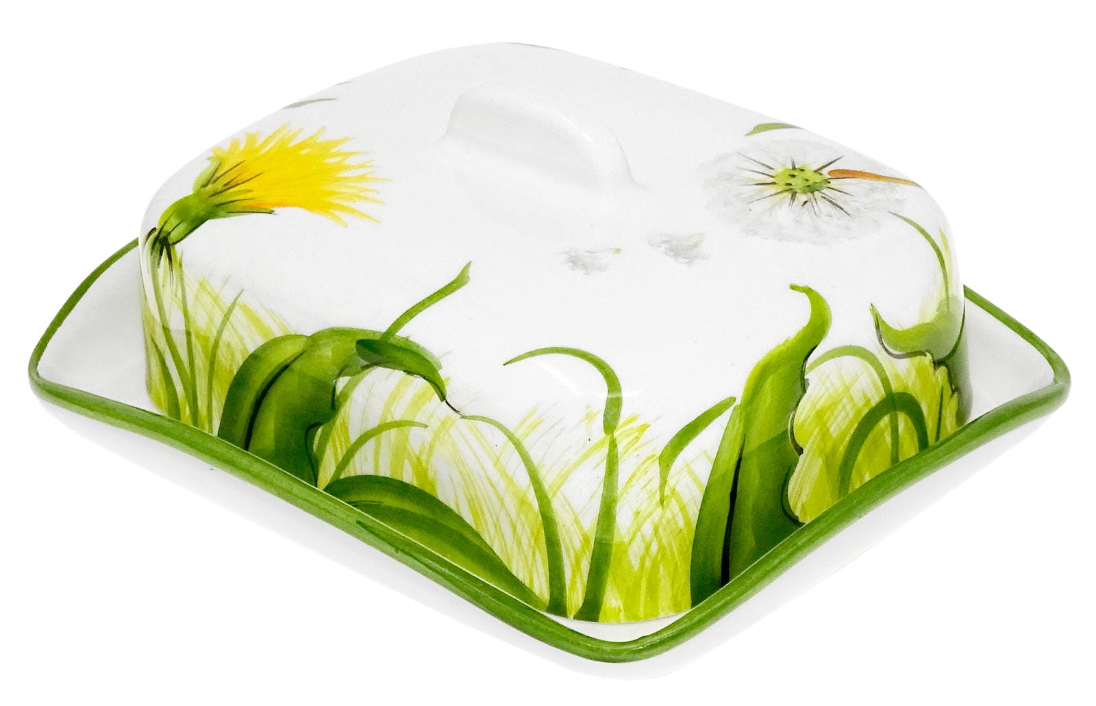 🌼 Den Frischhalte Deckel unseres großen Buttergefäßes ziert ein gemaltes Design aus blühenden Pusteblumen auf einer grünen Sommerwiese.
