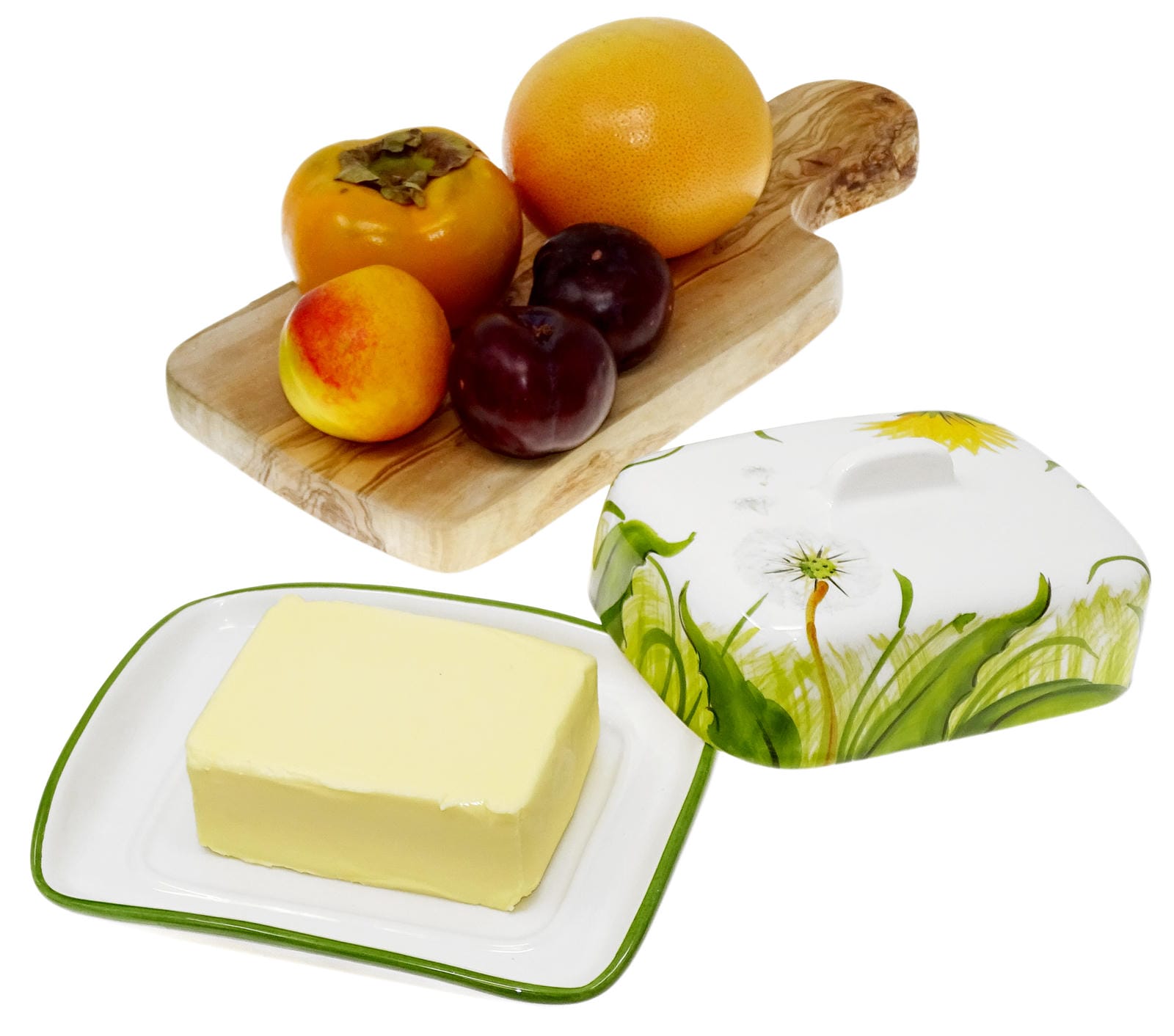 Ob mit einem Oliven Relief, dem fruchtigen Walderdbeeren Design oder sommerlichen Pusteblumen, unser mediterranes Buttergefäß ist wahrhaft ein traumhafter Anblick. Mit den drei erhältlichen Butterschalen Motiven genießen Sie Ihr Frühstück nochmal doppelt und dekorieren wundervoll Ihren Frühstückstisch.
