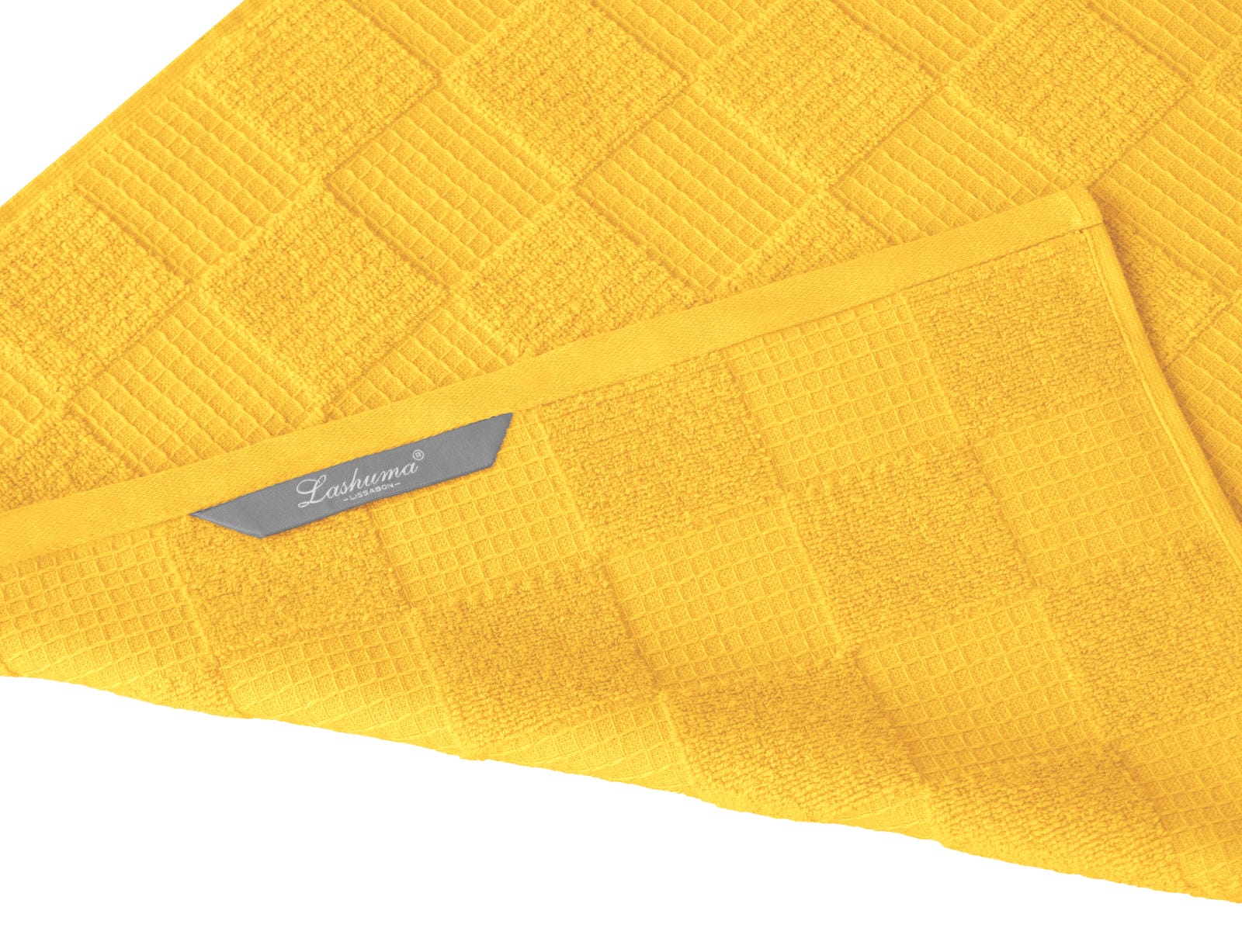 Bei diesen weichen Geschirrtüchern ca. 50x50 cm zeigen flauschiges Frottee und hochwertiges Waffelpique zusammen ihre ganze Kraft. Denn unsere 3 Stück Küchenhandtücher aus Baumwolle bestehen aus kuscheliger Frottee Struktur gepaart mit saugstarkem Waffelmuster. Während das Waffelpique viel und schnell Feuchtigkeit aufnimmt, sorgt die flauschige Frottee Oberfläche für puren Genuss auf der Haut. Im Nu sind unsere gelben Geschirrhandtücher wieder trocken, denn dank der Waffel Struktur lässt das einfarbige Handtuch Set viel Luft zum Trocknen durch. Damit diese modernen Trockentücher für die Küche Sie lange Zeit begleiten, bestehen unsere quadratischen Frotteetücher mit Waffel Muster aus 100% Baumwolle. Ausgestattet sind die erstklassigen, gelben Küchenhandtücher mit der Frottee Qualität 420 g/qm.