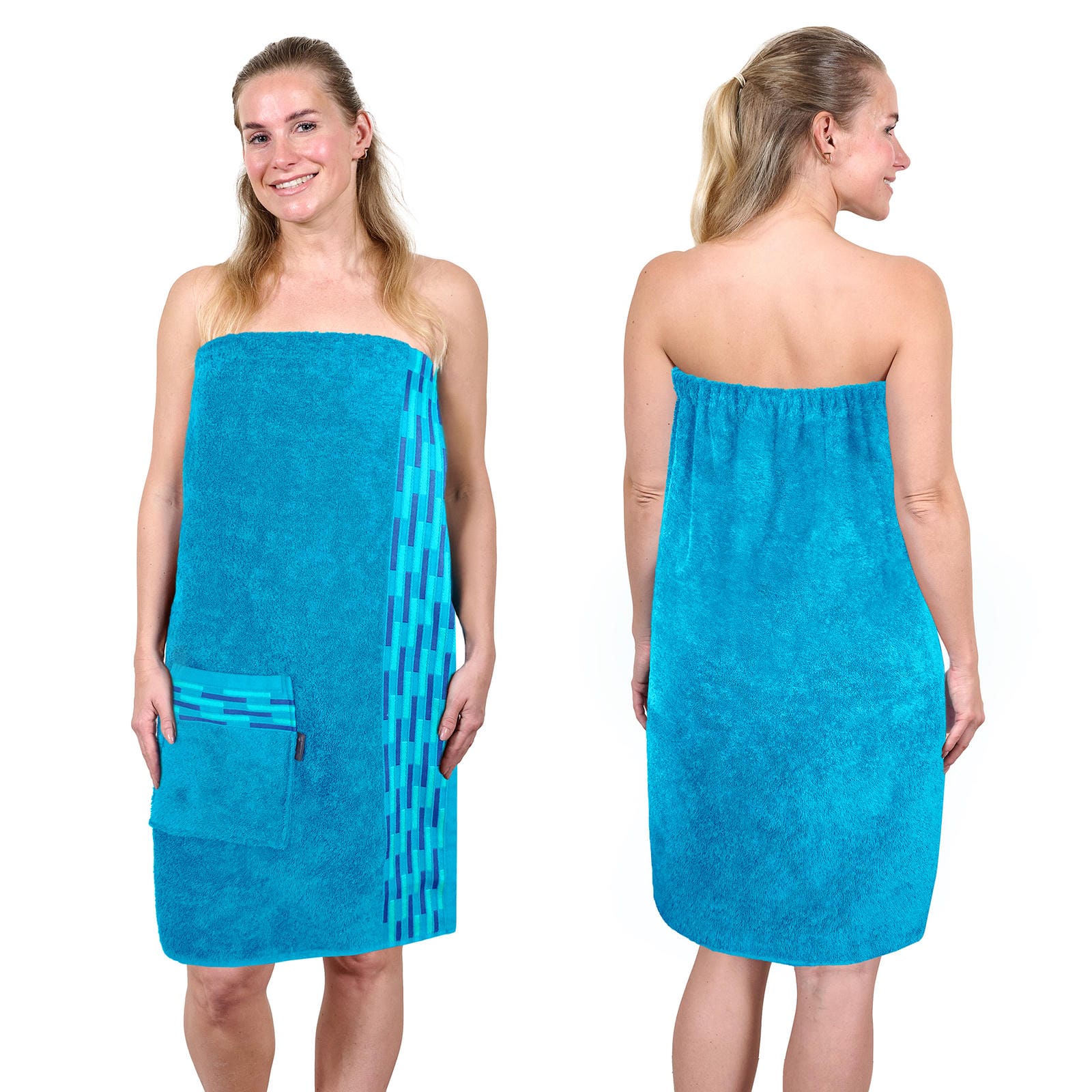 Dieser hochwertige Damen Saunakilt ist ideal für die Sauna, das Spa, den Wellnessbereich oder für entspannte Momente nach dem Bad. Durch seine hohe Funktionalität und das stilvolle Design wird dieses Frottee Handtuch Kleid schnell zum unverzichtbaren Begleiter für Ihre Wohlfühlzeiten. Genießen Sie die Kombination Ihres deluxe Sauna Zubehörs aus Komfort, Saugstärke und eleganter Optik mit dem Saunahandtuch blau – aquamarin der Lugano Serie und verwandeln Sie Ihr Wellness Erlebnis in ein echtes Highlight. Ein perfektes, saugstarkes Saunakilt für Damen, die Wert auf Qualität und Stil legen.