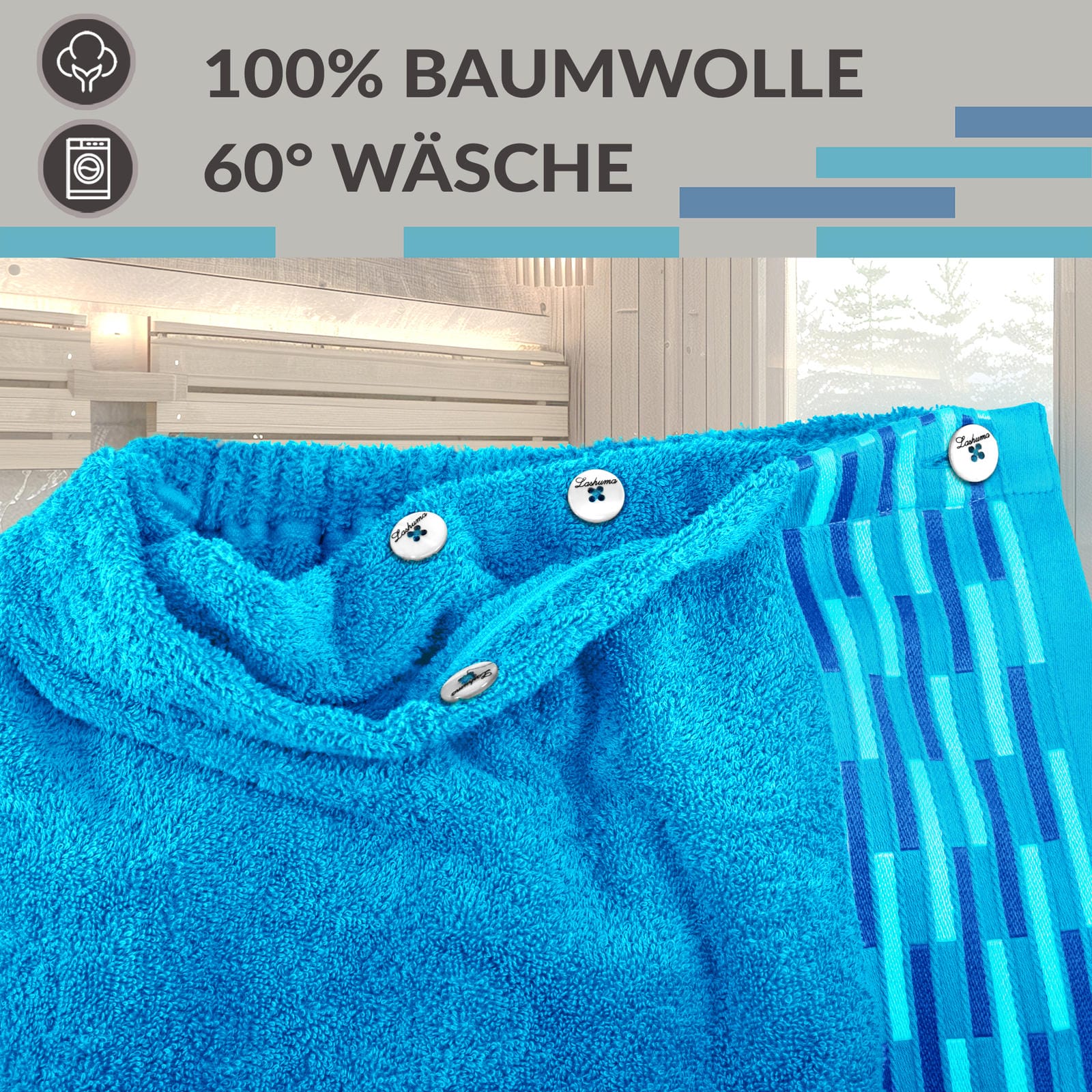 ELEGANTES DESIGN MIT KNÖPFEN: Der stilvolle Baumwoll Saunatuch in Blau - Aquamarin hat 8 Knöpfen für sicheren Halt und flexible Anpassung. Ideales Sauna Kilt für Frauen, ein elegantes saugstarkes Handtuch Kleid.