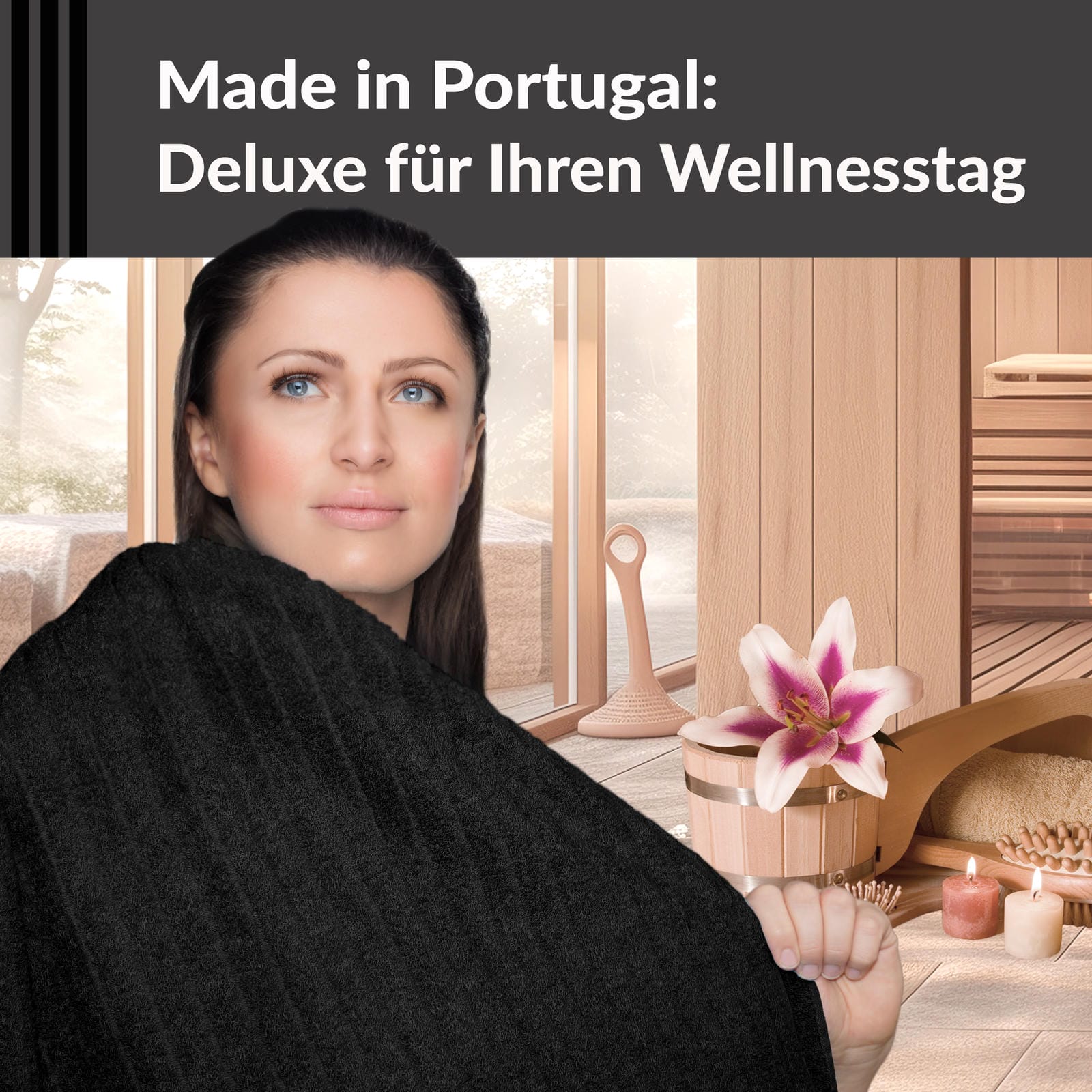 Unser Frottee Saunatuch schwarz 80x200 cm bietet Ihnen einen Hauch von Luxus und Komfort für Ihre Auszeit in der Sauna. Hergestellt in Portugal erfüllt dieses hochwertige Baumwolle XXL Handtuch alle Ansprüche an Qualität und Design. Die großzügigen Abmessungen machen es sowohl als Saunahandtuch für Damen als auch als Saunatuch für Herren zur idealen Wahl und bieten eine komfortable Abdeckung.