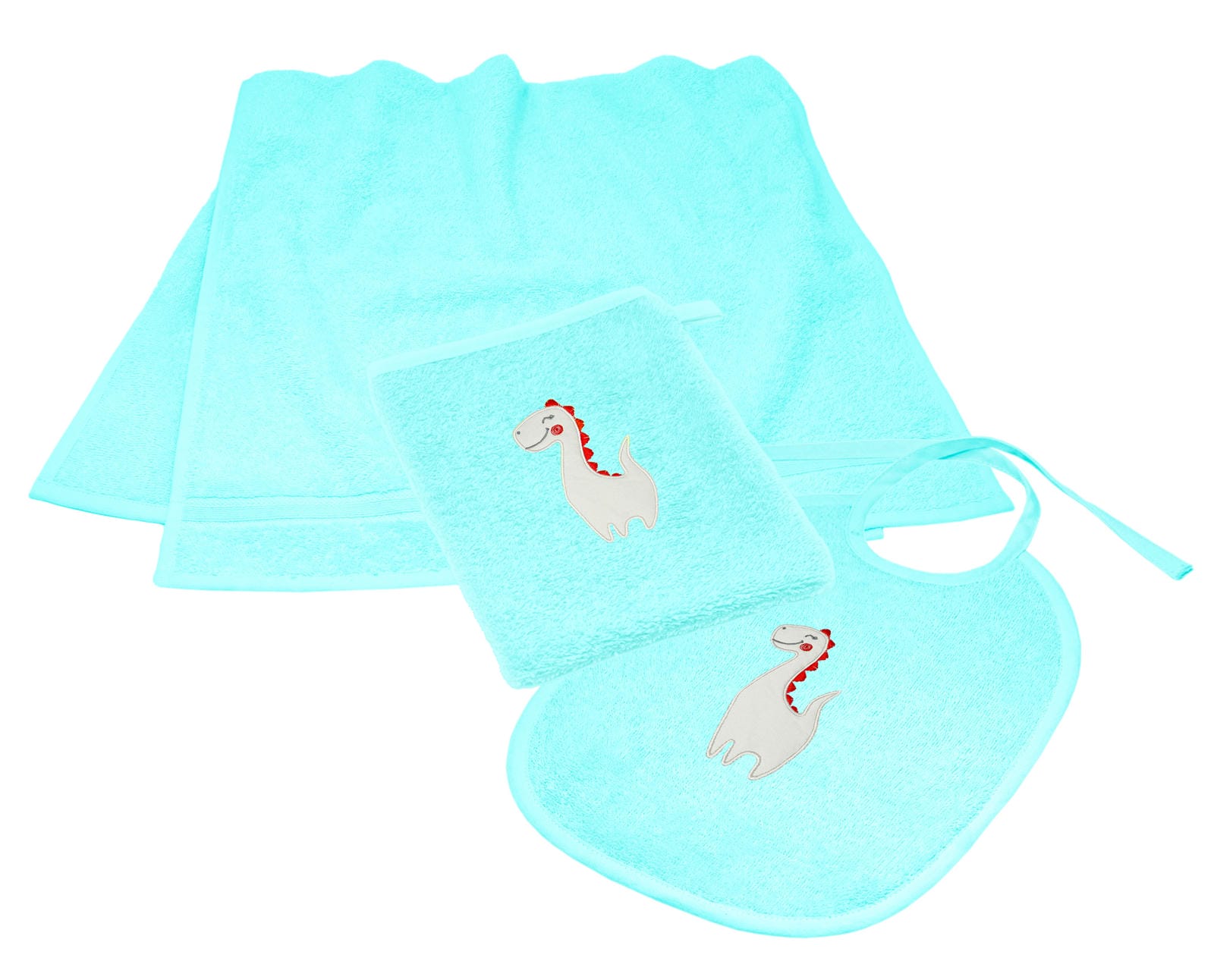 Das Set bietet 3 Stück besticktes Frottee Zubehör: 1x Babywaschlappen ca. 15x21 cm, 1x Baby Handtuch ca. 50x90 cm und 1x Kinder Lätzchen ca. 25x30 cm.