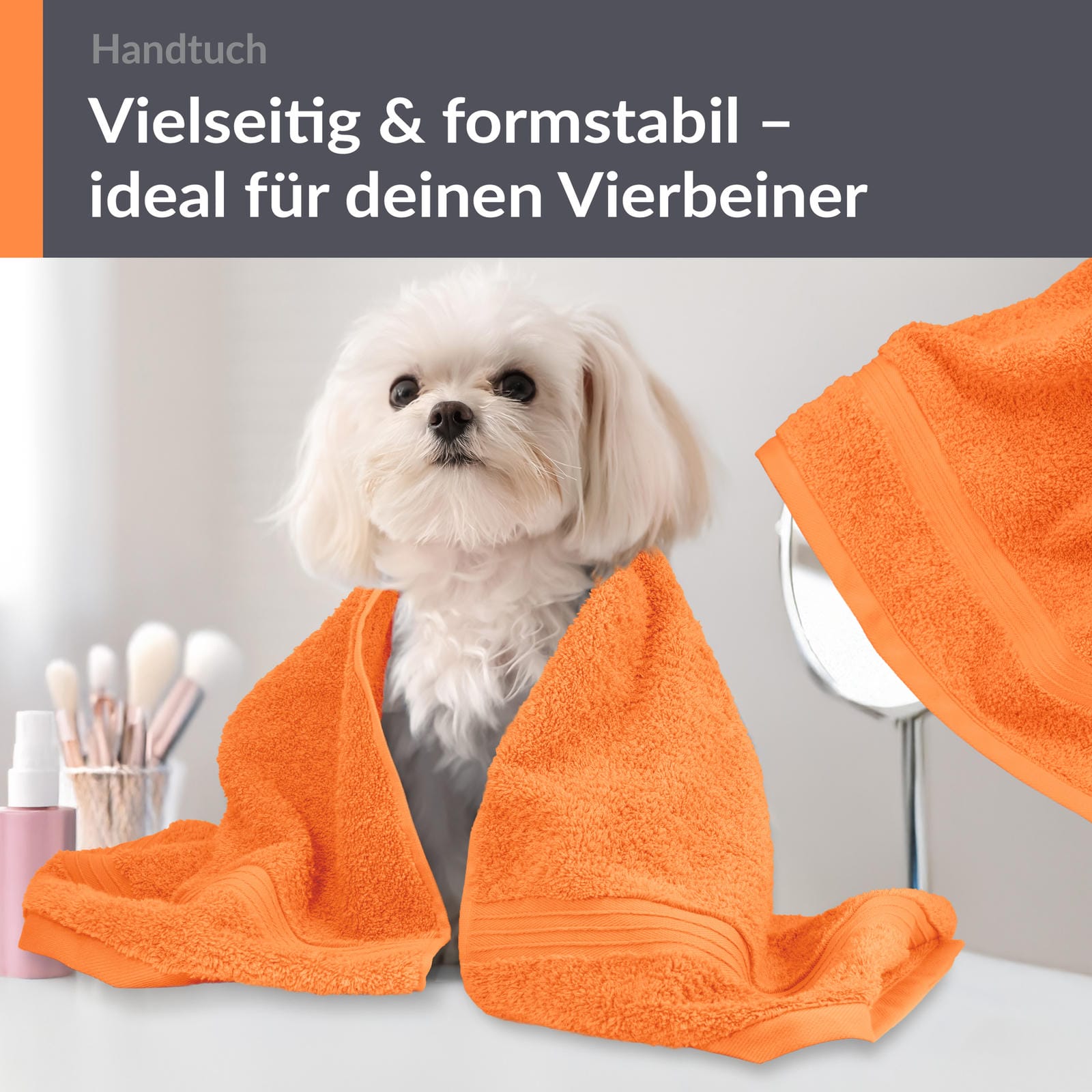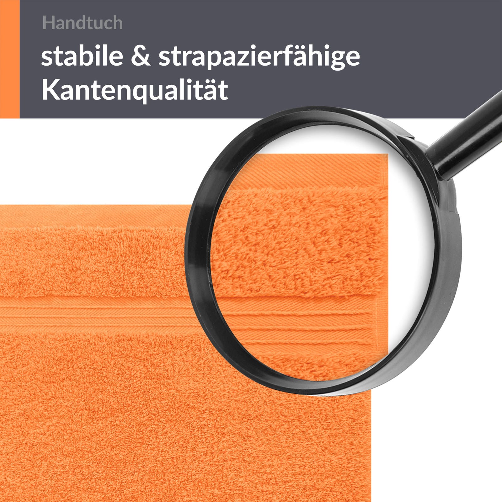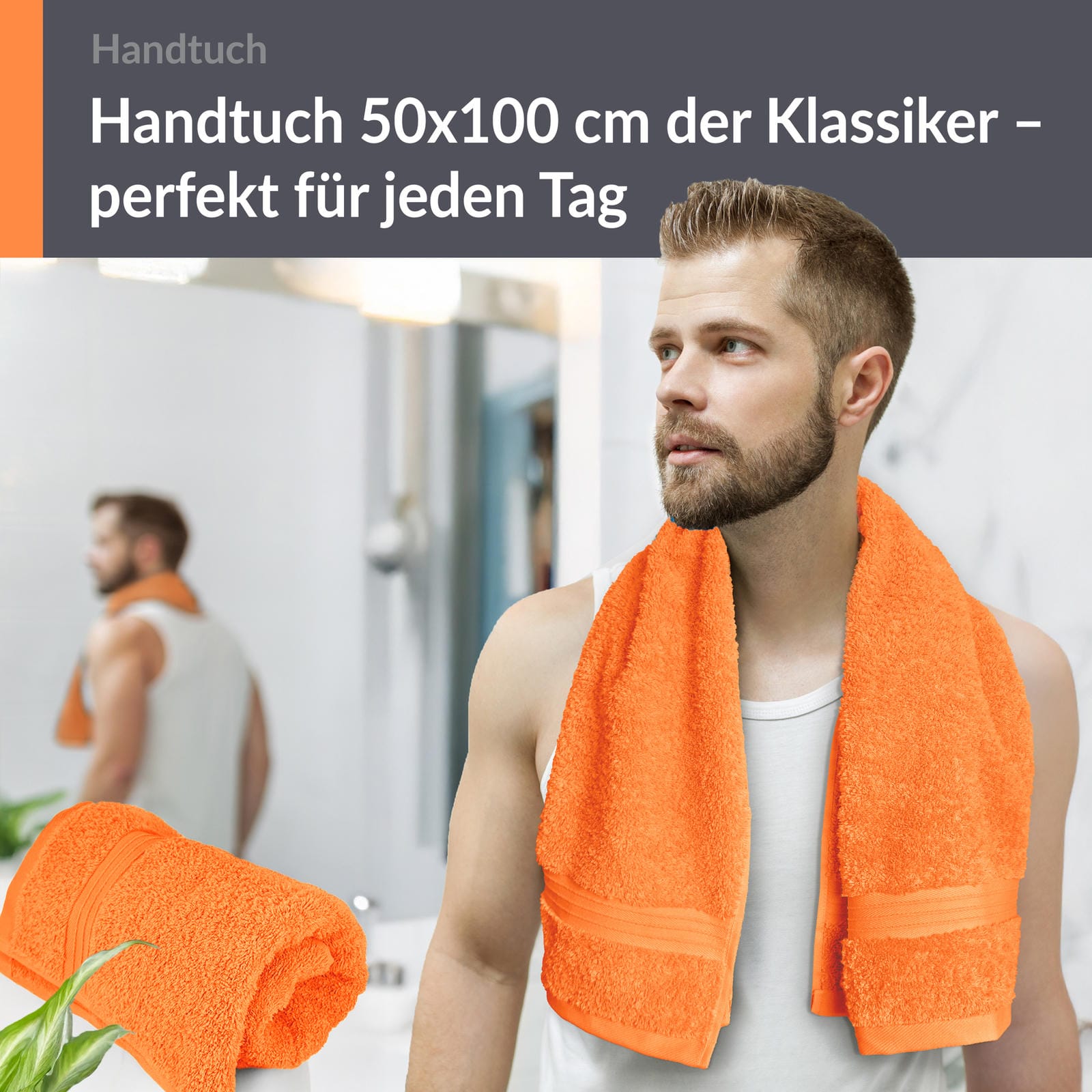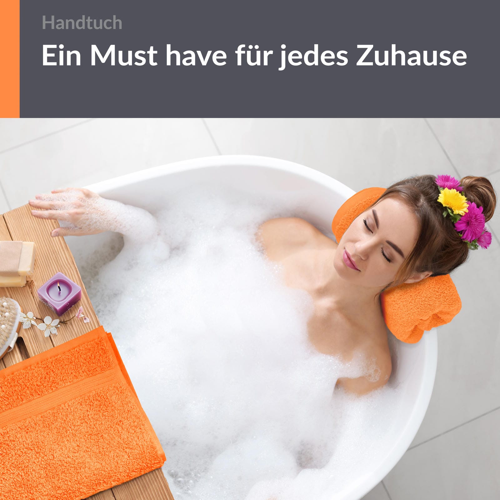 Setzen Sie mit den orangenen Kopfhandtüchern neue Akzente. Mit den 16 erhältlichen Farben der hochwertigen Frotteehandtücher ist hoher Kombinationsspaß angesagt.
