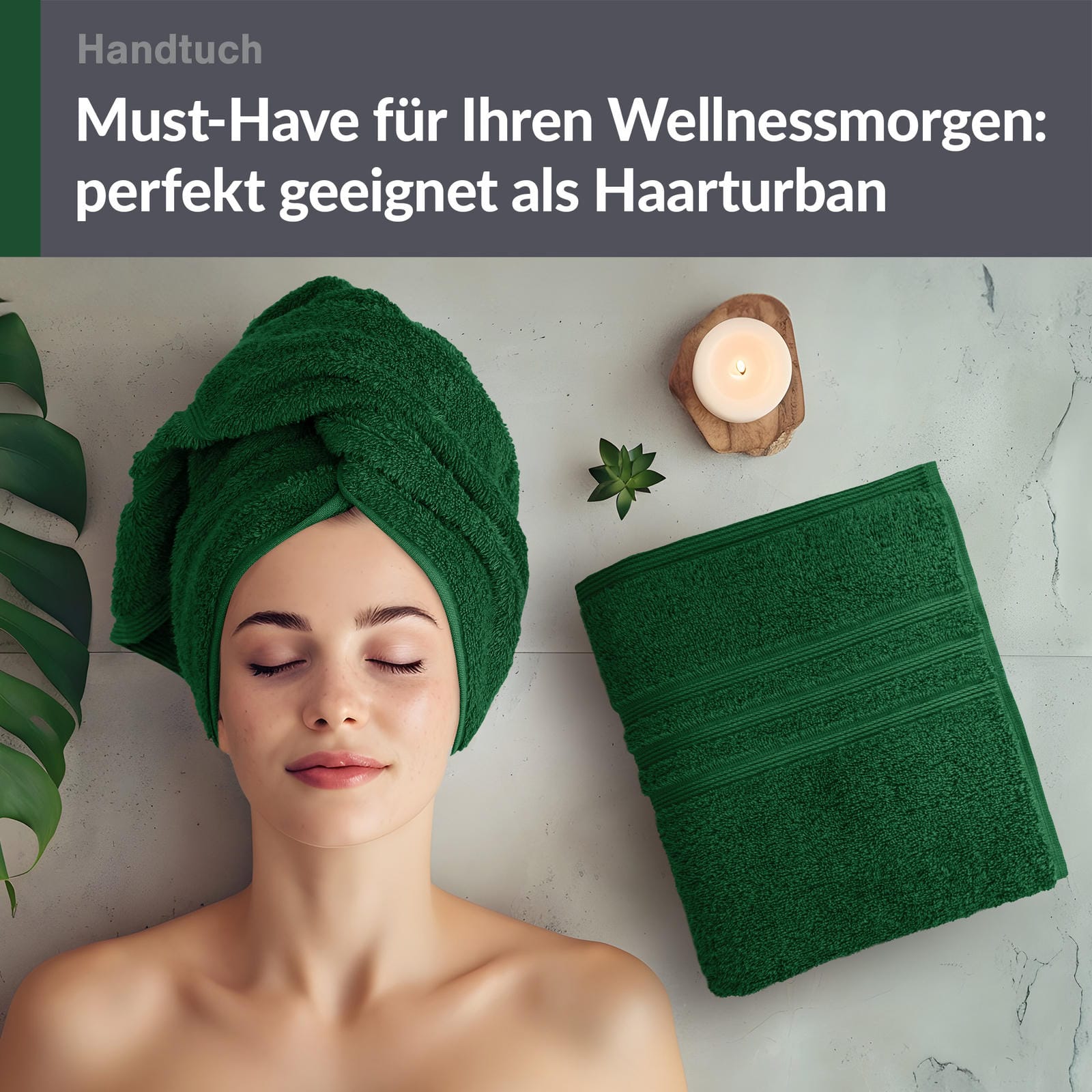 ZARTE ELEGANZ: Genießen Sie den sanften Luxus dieses 2er Frottee Handtuch Sets in Tannen Grün, gefertigt aus 100% reiner Baumwolle. Die dezente Farbgebung verleiht Ihrem Badezimmer eine ruhige und stilvolle Atmosphäre.