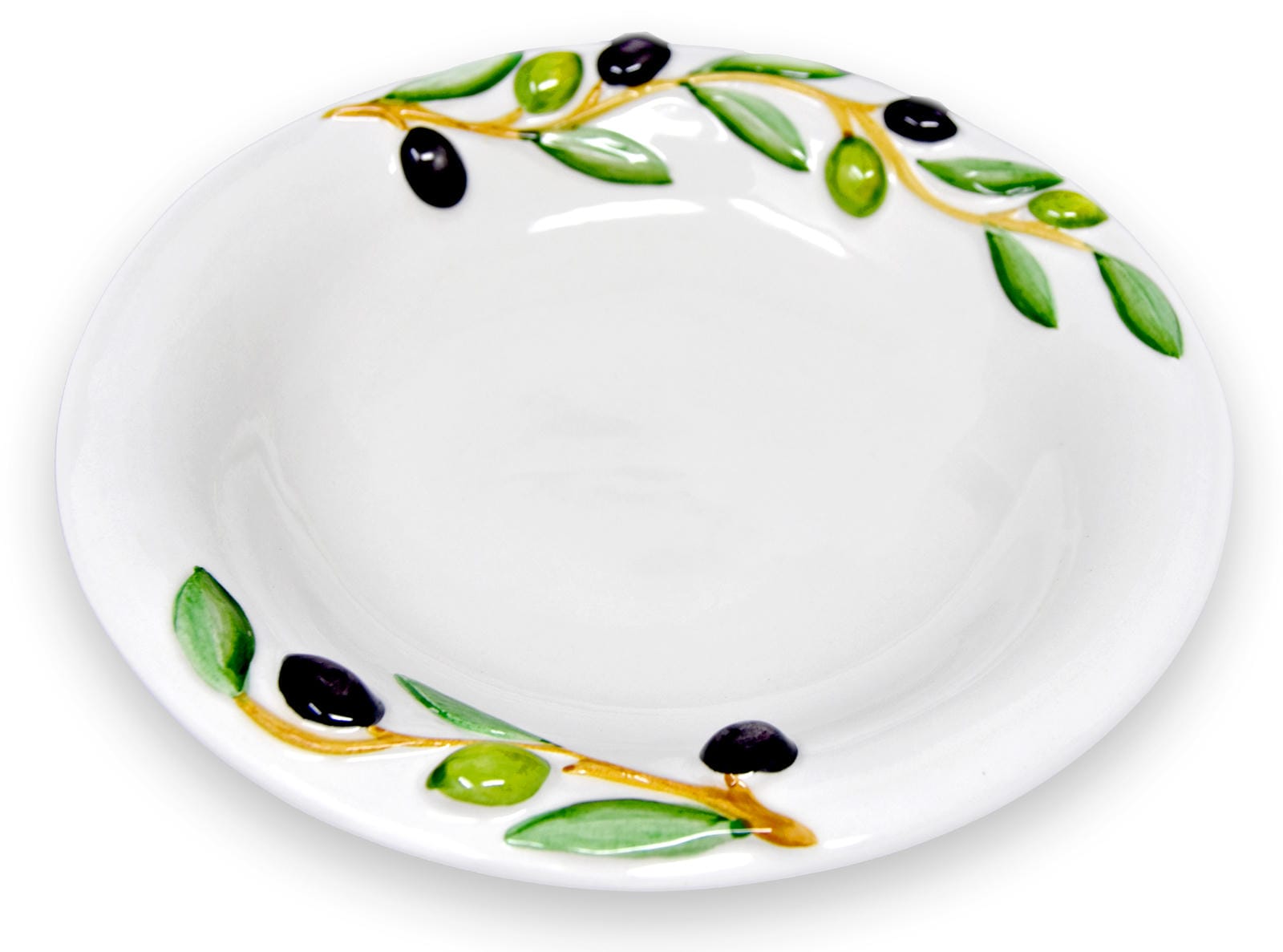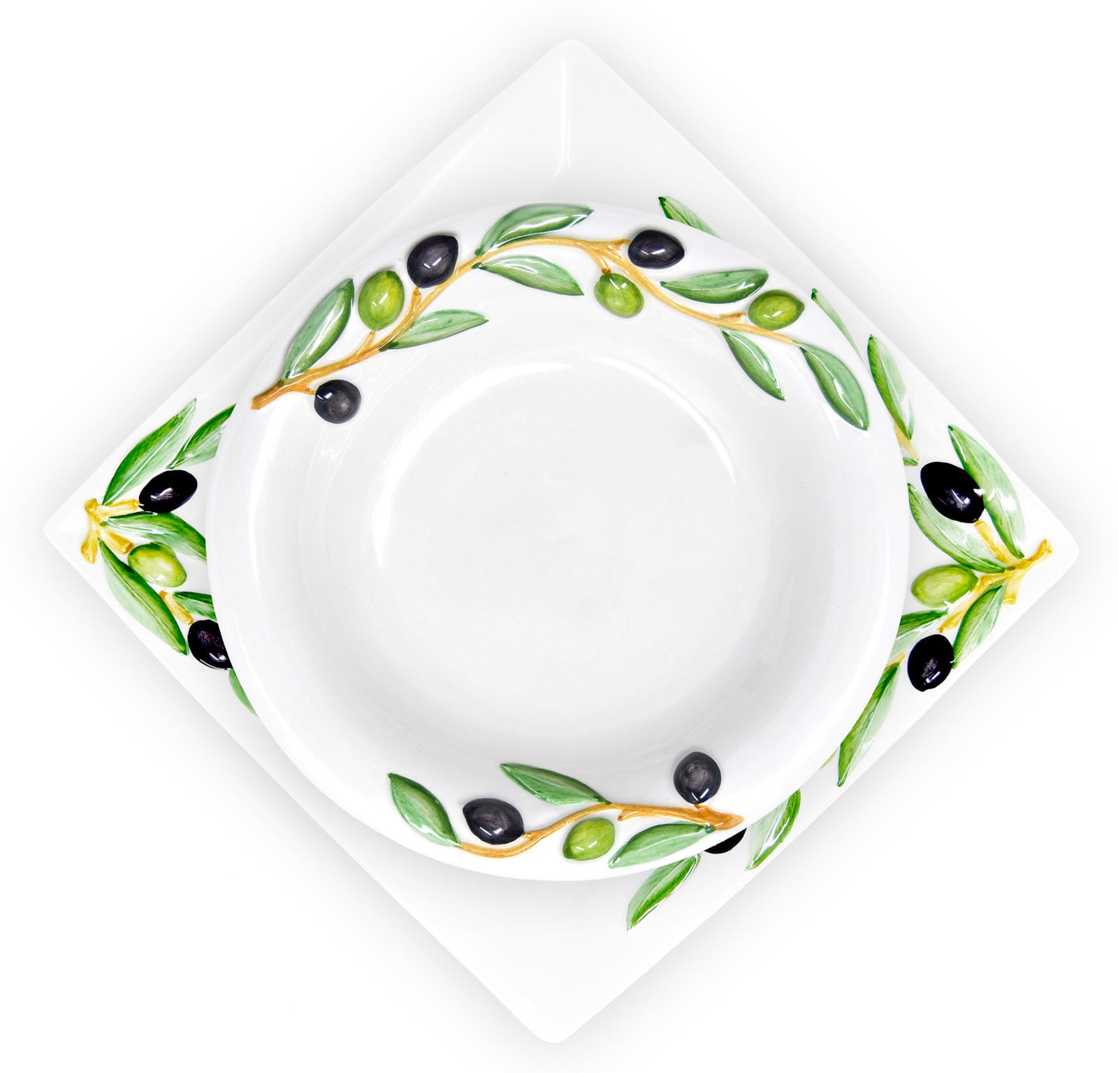 🫒 Das 2er Pack aus Servierteller und tiefer Essteller bringt mit dem edlen, handbemalten Relief Dekor in Form reifer Oliven südländisches Flair auf jeden Esstisch.